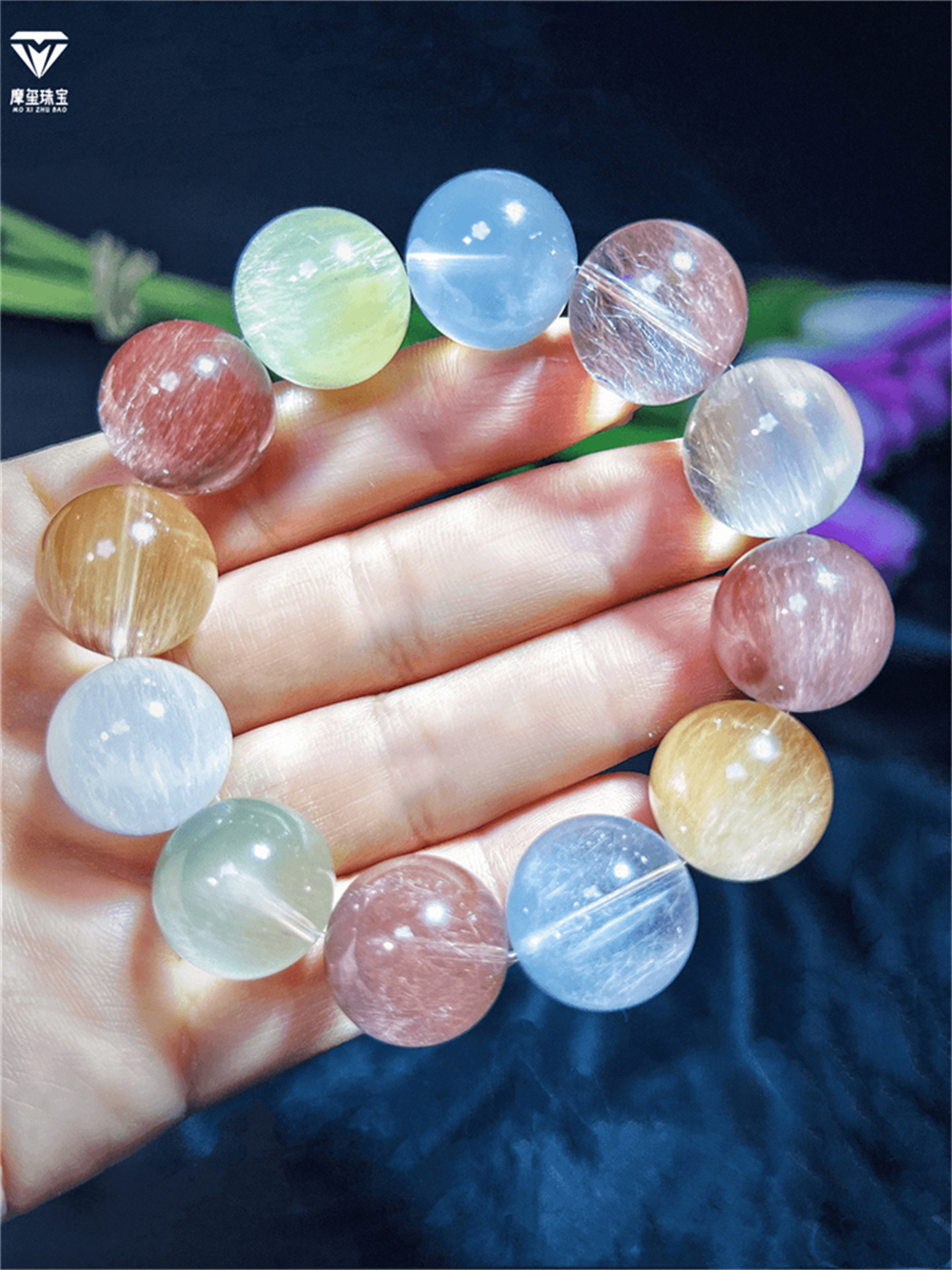 Natural Colored Rabbit Fur Crystal Bracelet, Gem-Grade Colored Rabbit Fur Bracelet, Old Mine Cat's Eye Blue Colored Rabbit Fur Round Beads, Large Size