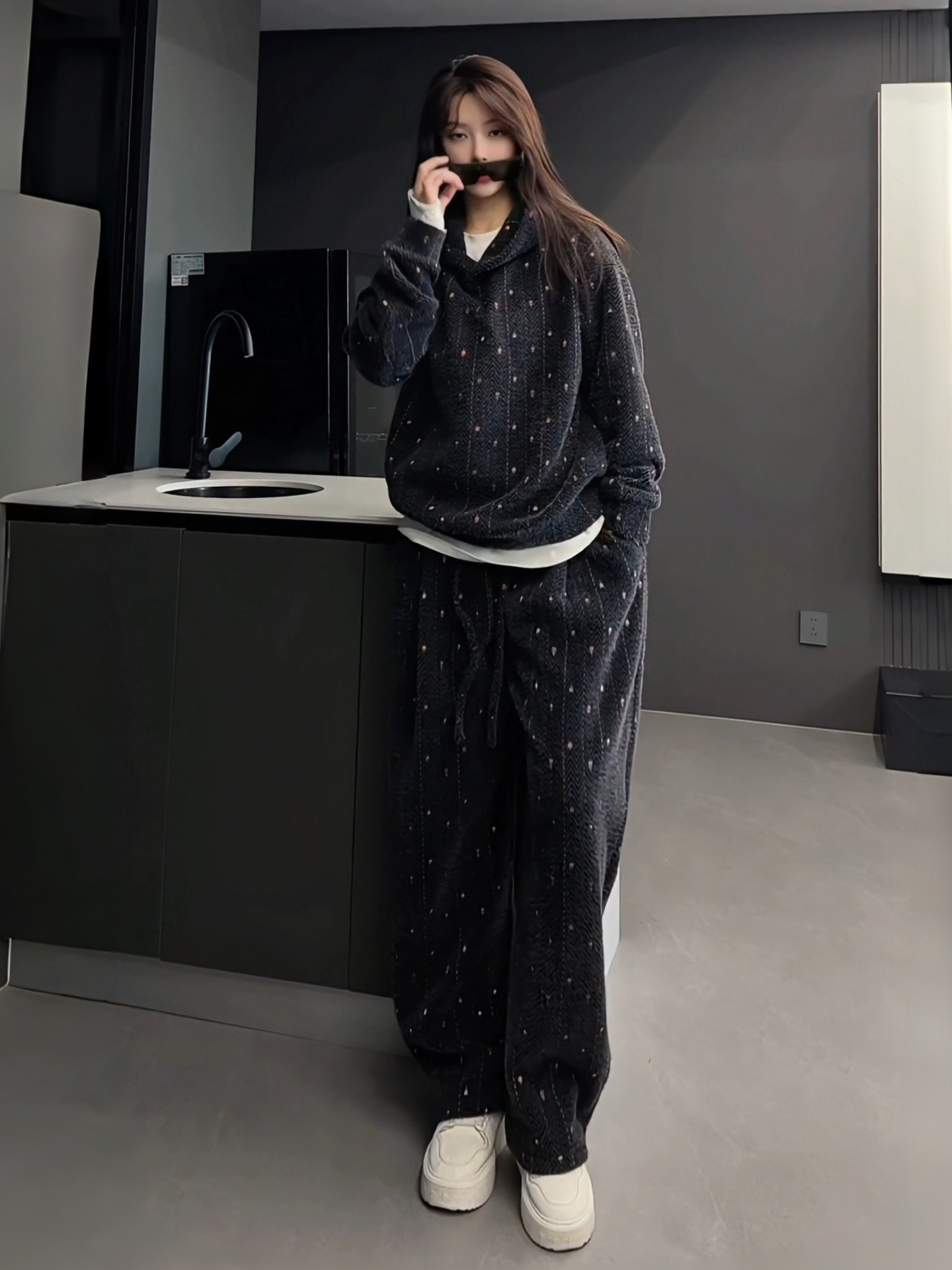 【High Quality】Thickened and Warm Unisex Fashionable Color-Woven Hooded Sweatshirt and Casual Pants Fashionable and Comfortable Set