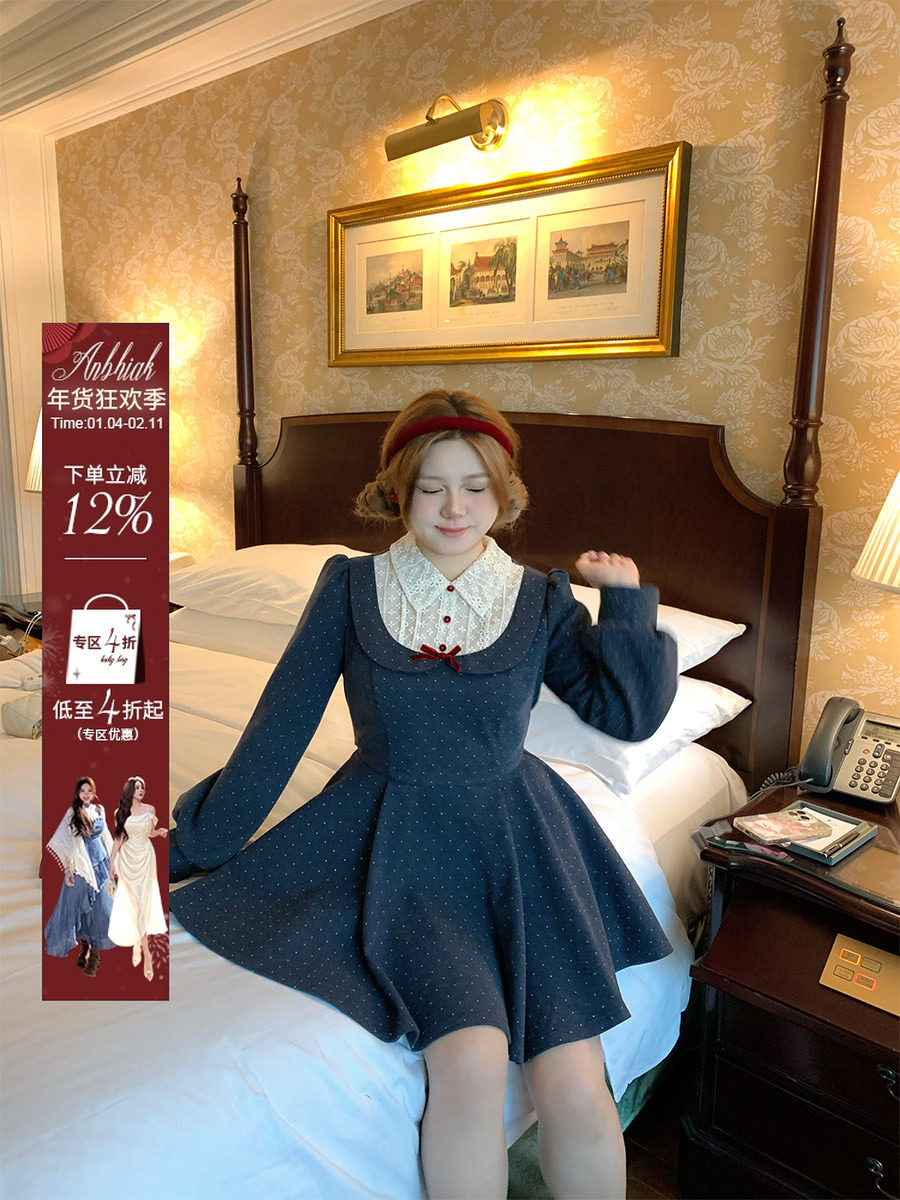 Annie Is Not Popular. Fake Two-Piece Polka Dot Print Tie-Up Woolen Dress for Women, Slightly Plus Size, Waist-Cinching, Rich Lady Style Dress