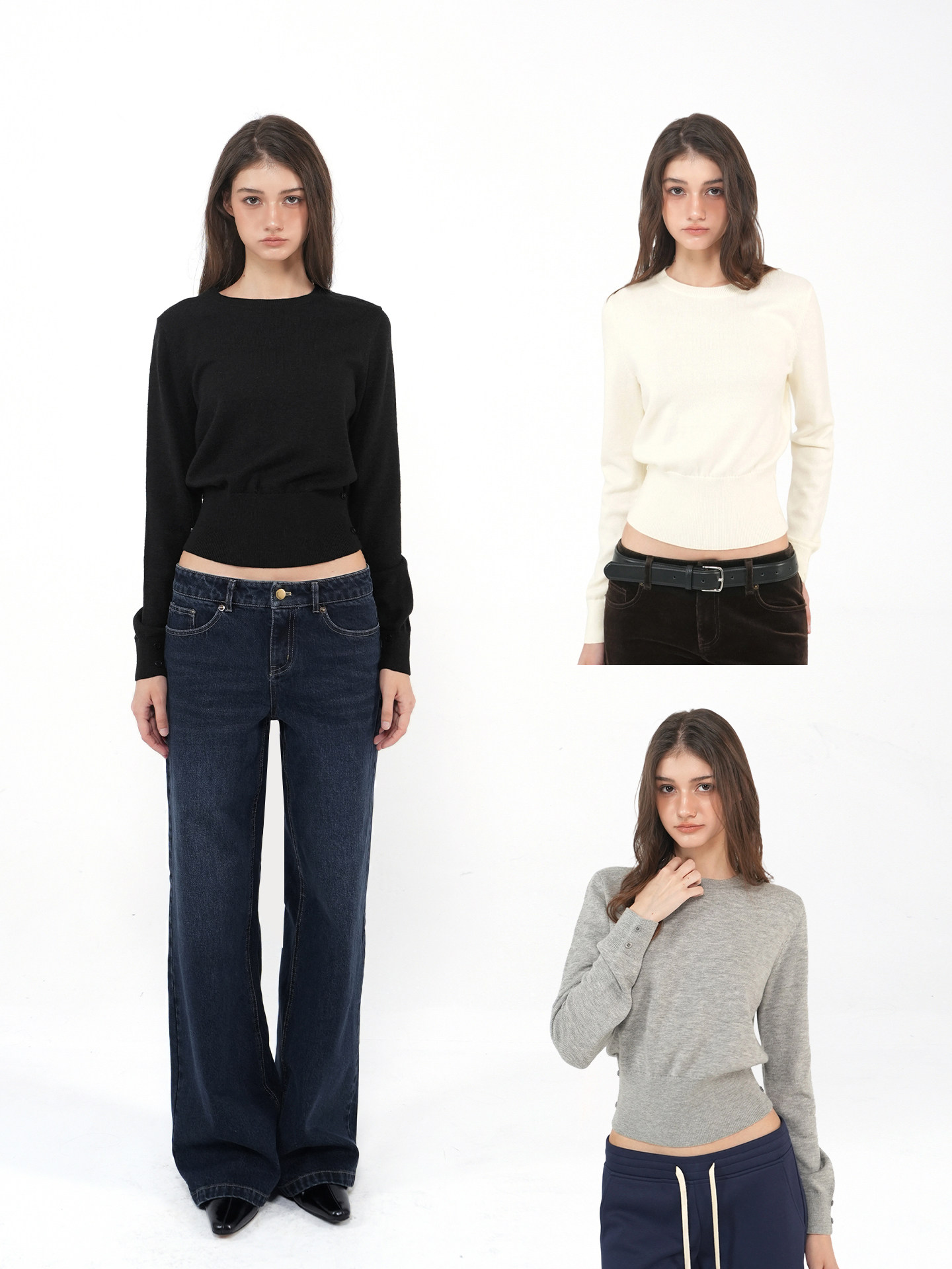 Jim Kennet Three-Color Loose Round-Neck Waist-Cinching Long-Sleeved Knitted Top