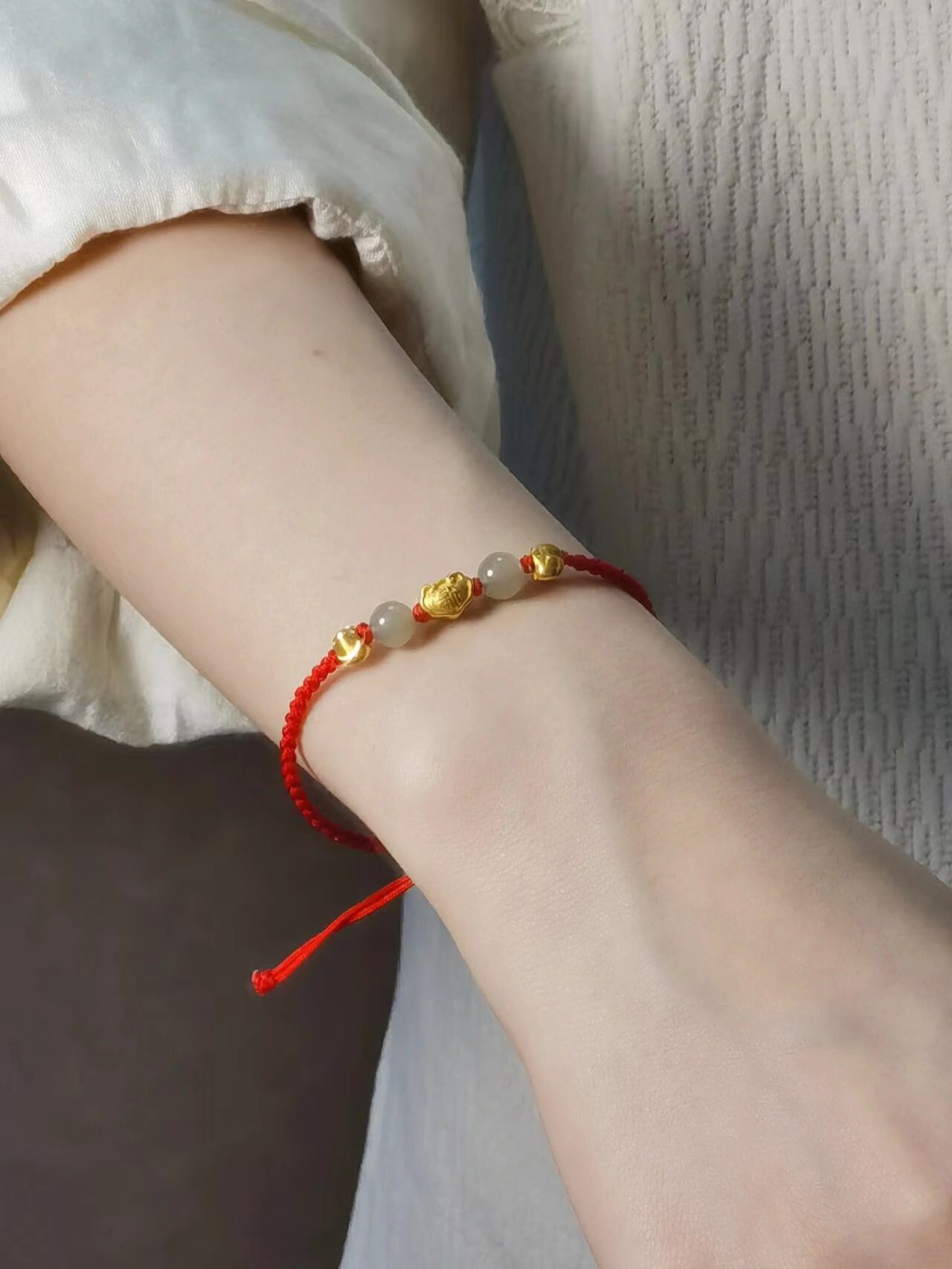 999 Pure Gold Ruyi Peace Lock Bracelet for Women, Birth Year Gift, Gold Fortune Bead, Blessing Lock, Red String Braided Bracelet