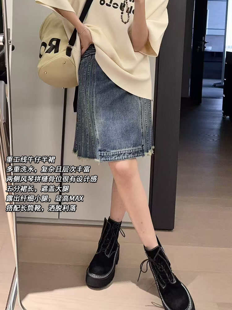 Meiyang【In Stock】Accordion Skirt Distressed Washed High Waist Patchwork Belt Frayed Denim Skirt