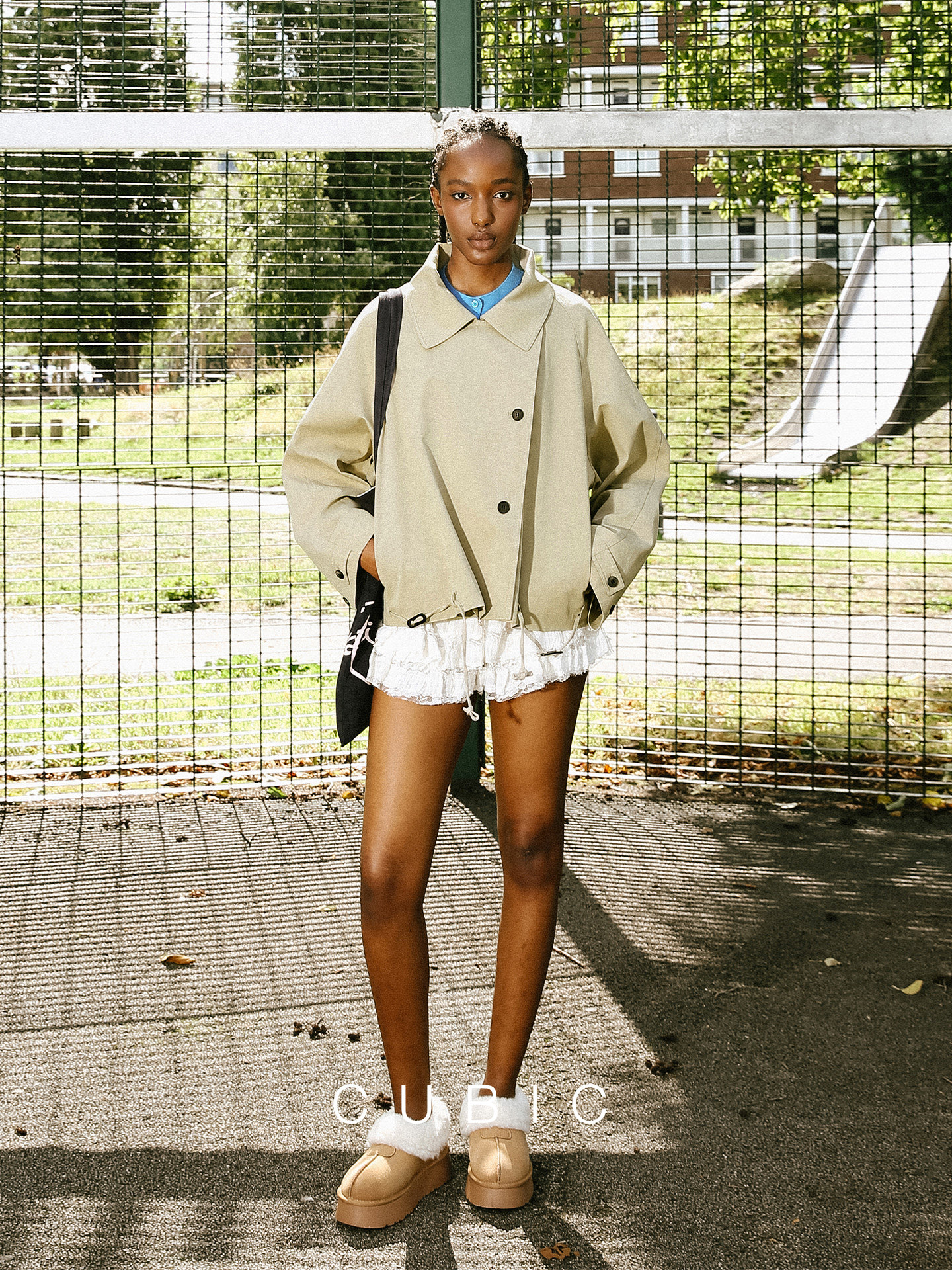 【Nana's Style】Cubic Commuter Silhouette Three-Dimensional Lapel Drawstring Tie Khaki Short Trench Coat Jacket