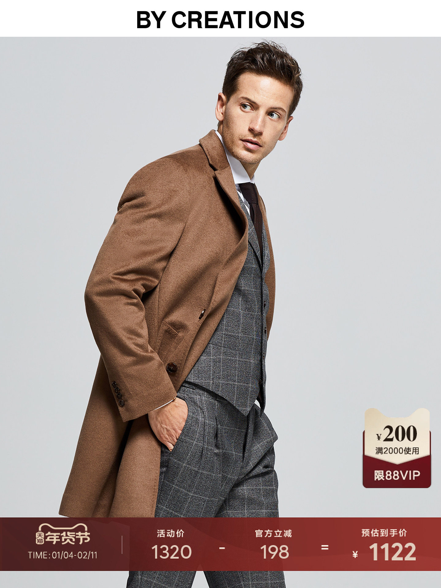 Bai Pin Pure Australian Wool Chesterfield Camel Coat Men's Mid-Length Lapel Business Woolen Jacket