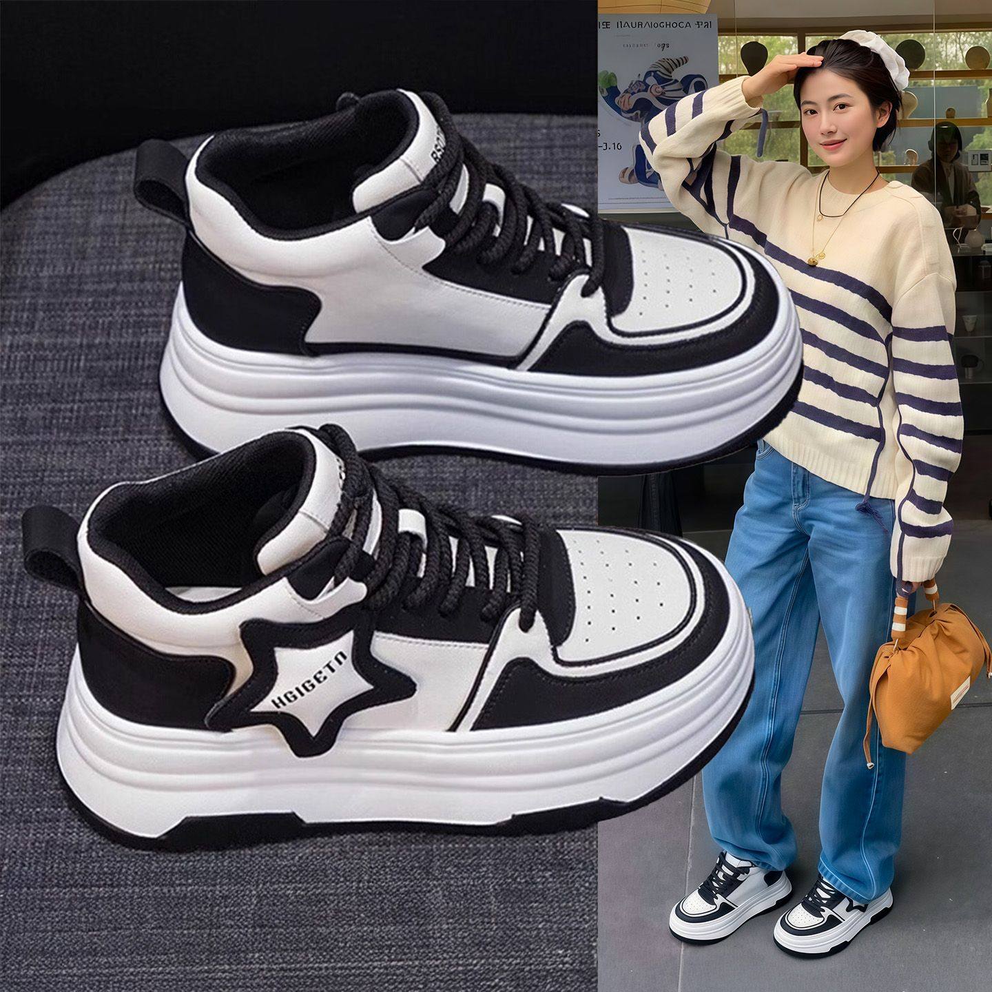 Hong Kong Black and White Star Panda High-Top White Sneakers for Women 2025 Spring New Versatile Thick-Soled Platform Casual Shoes