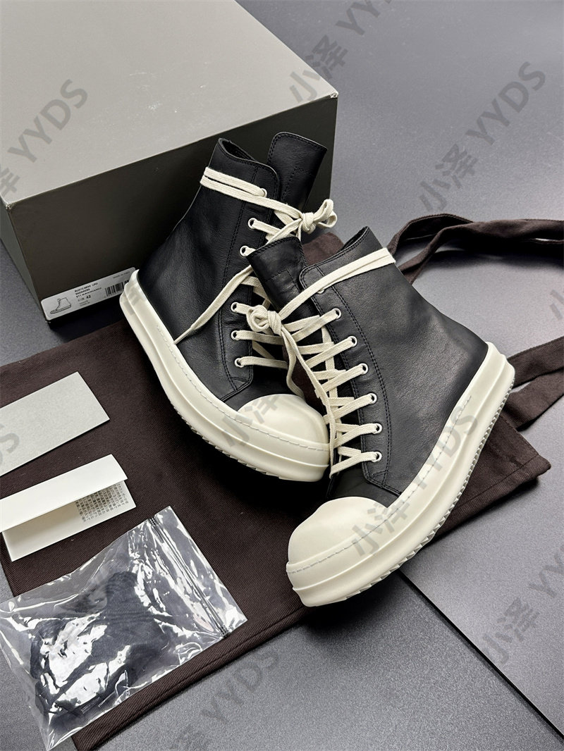 Rick Ocean Ro Independent Main Line Leather Upper, Secondary Line Canvas, Milky White Sole, Thick Shoelaces, Black and White High Street High-Top Shoes