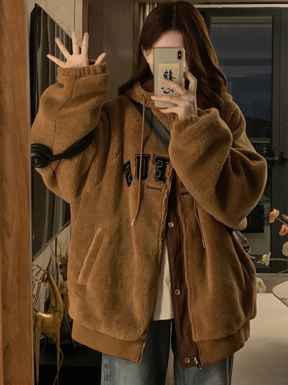 Muji Women's Long Fleece Coat Long-Sleeved Autumn and Winter Lamb Wool Jacket Outerwear Women's Clothing
