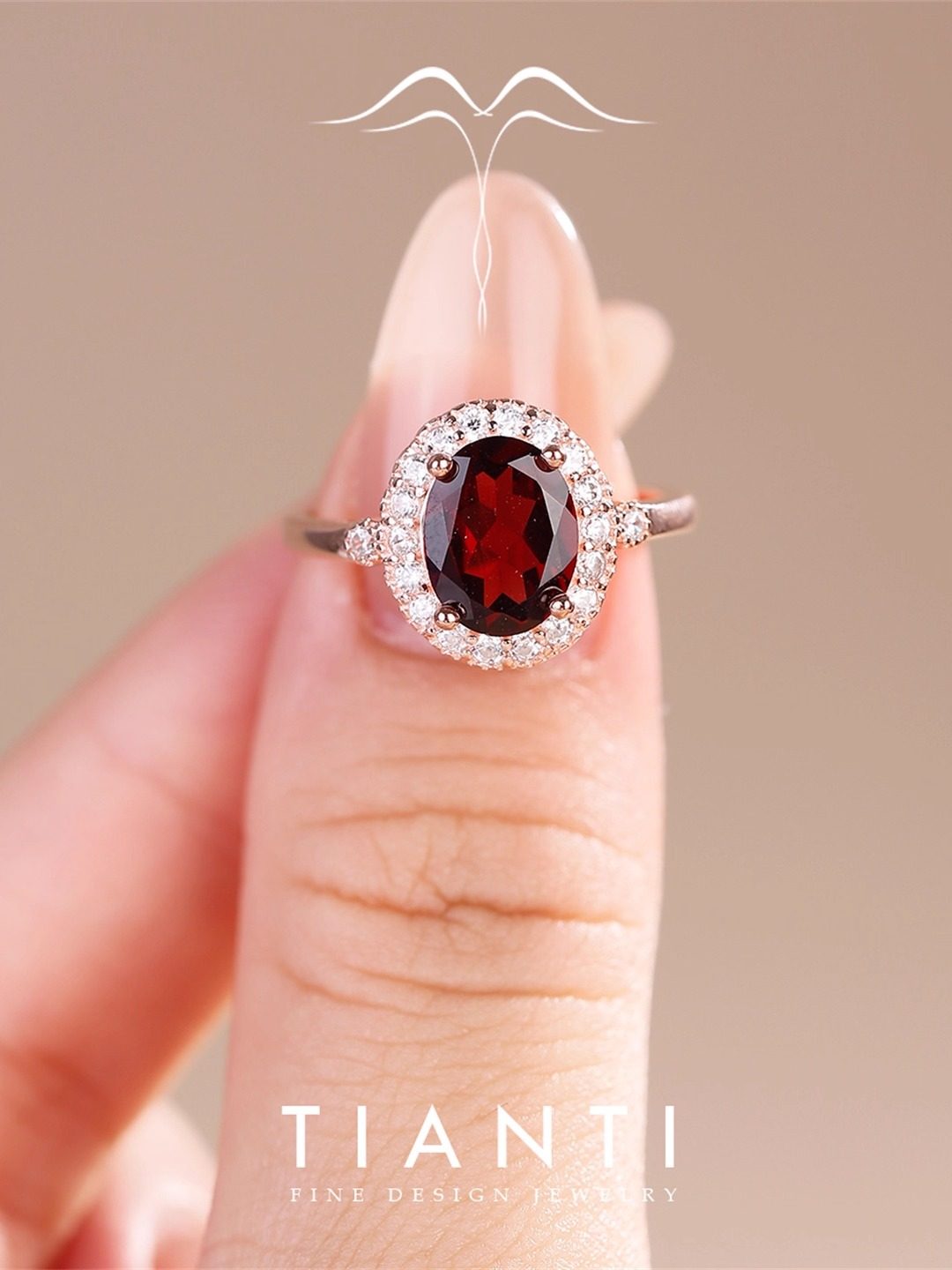 2.5 Carat Natural Garnet Gemstone Ring, Eucalyptus S925 Silver, 18K Gold, Vintage High-End Adjustable Ring for Women