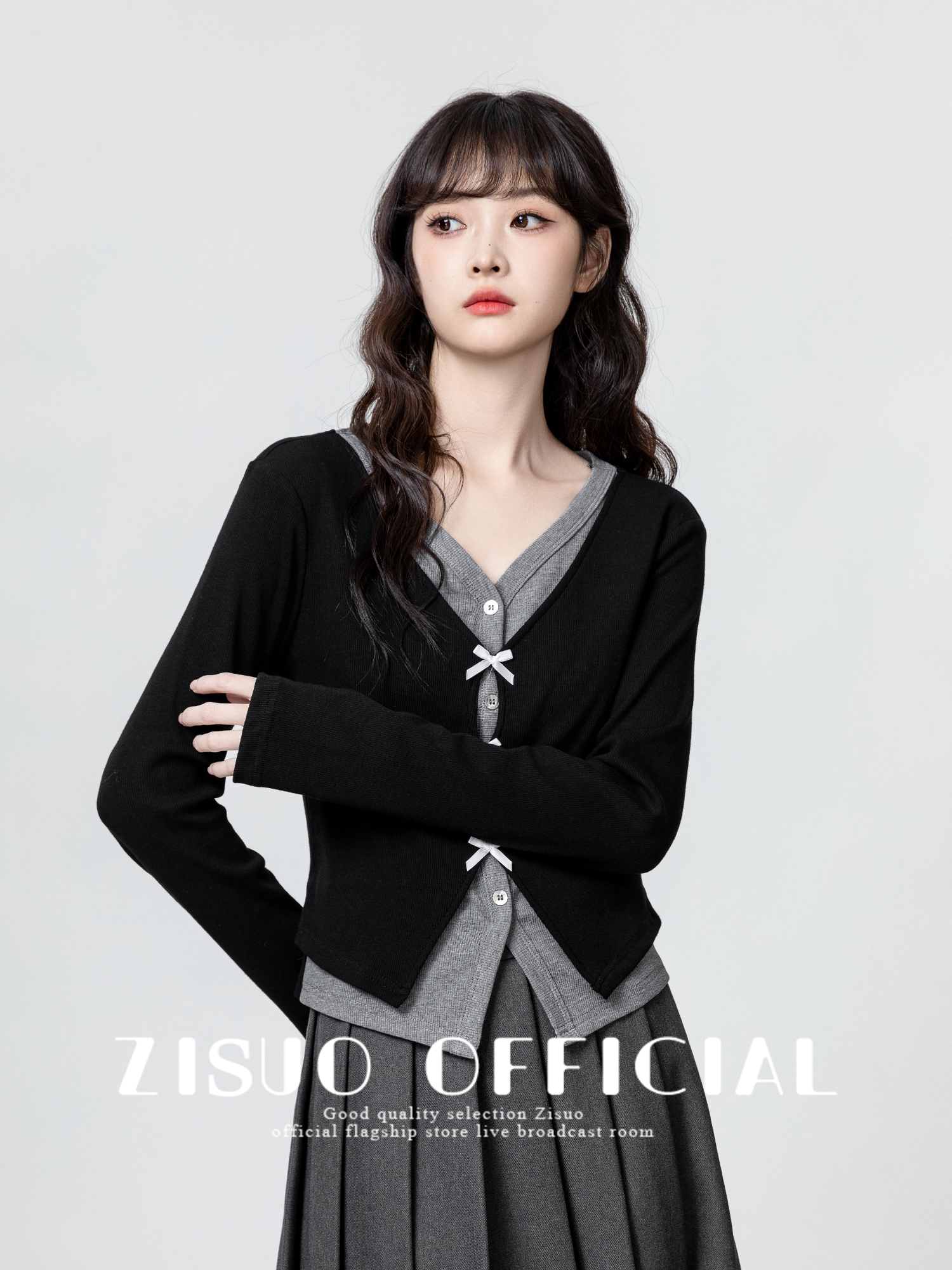 Black Fake Two-Piece V-Neck Long-Sleeve T-Shirt for Women, 2025 Spring and Autumn New Style, Bow Design, Slimming Short Top
