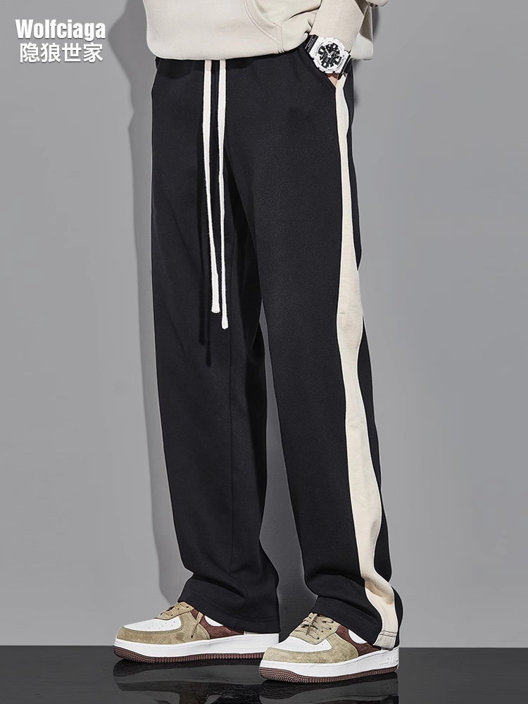 Men's Sweatpants for Autumn and Winter, Heavyweight, Loose Straight-Leg Casual Pants, Drapey Striped Knit Long Pants, Fleece-Lined Wide-Leg Sports Pants