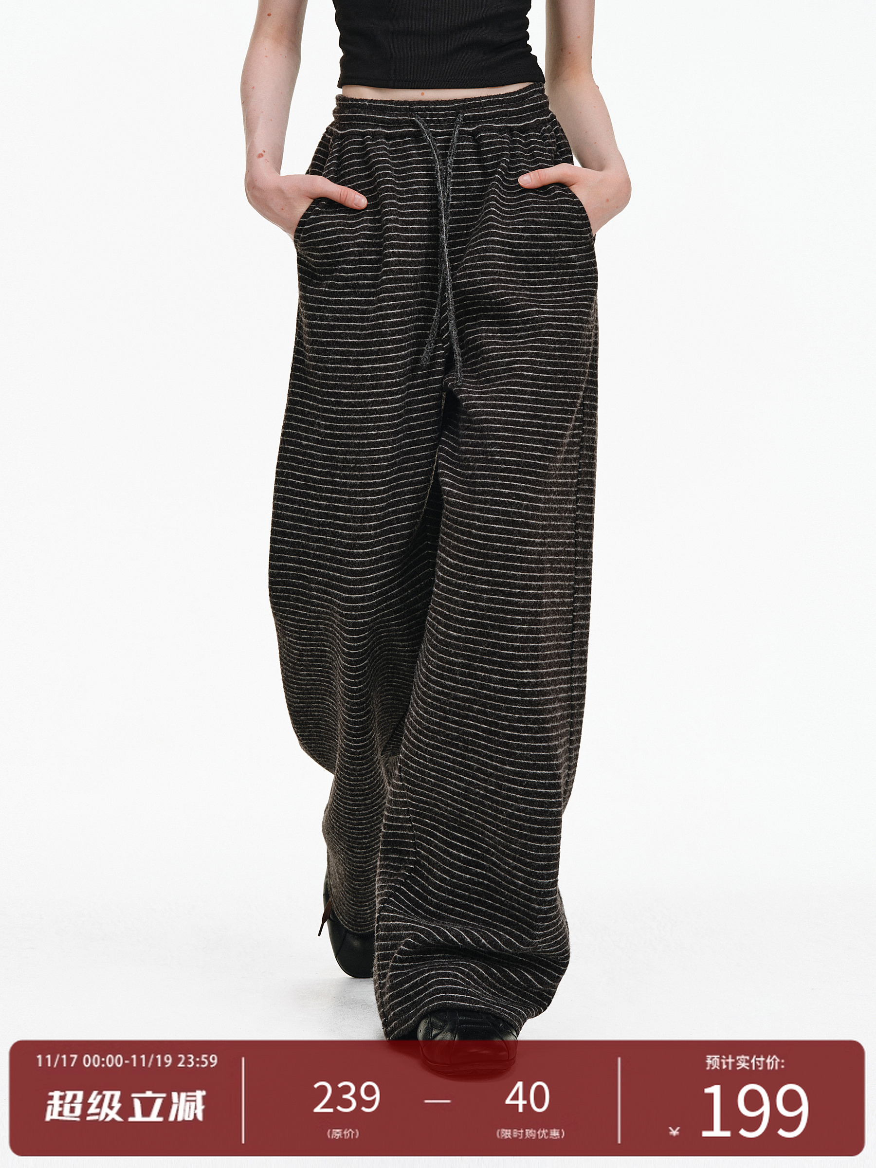 Pclp Curved Hem Casual Striped Sweatpants, Versatile Loose Straight-Leg Drapey Wide-Leg Drawstring Design Long Pants for Autumn and Winter