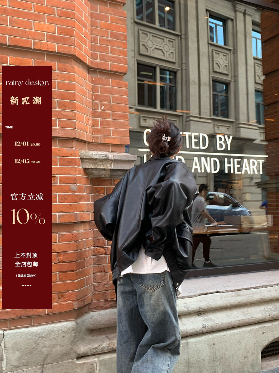 Rainy Cool Girl Style Biker Leather Jacket Spring and Autumn Women's New American Style Black Retro Top Coat