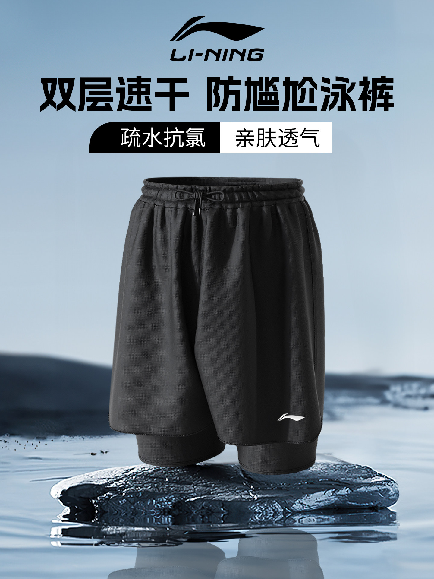 Li-Ning Men's Swimming Trunks Anti-Embarrassment Beach Shorts Youth Double-Layer Quick-Dry Five-Point Shorts Swimming Cap and Goggles Set