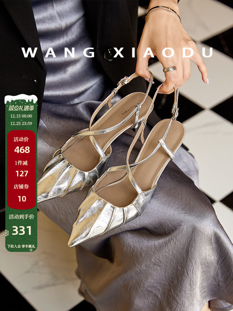 【Wang Xiaodu】Fenghua (Or: Elegance) ○ High-Quality ~ Cross-Strap Pointed Toe Backless Sandals for Women, Summer Genuine Leather Pleated High Heels