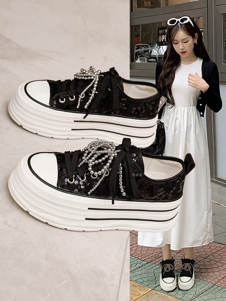 Sanli Small-Sized Thick-Soled Height-Increasing Canvas Shoes for Women, 2025 Spring and Summer New Style, Pearl Lace-Up Round-Toe Casual Sneakers, Trendy