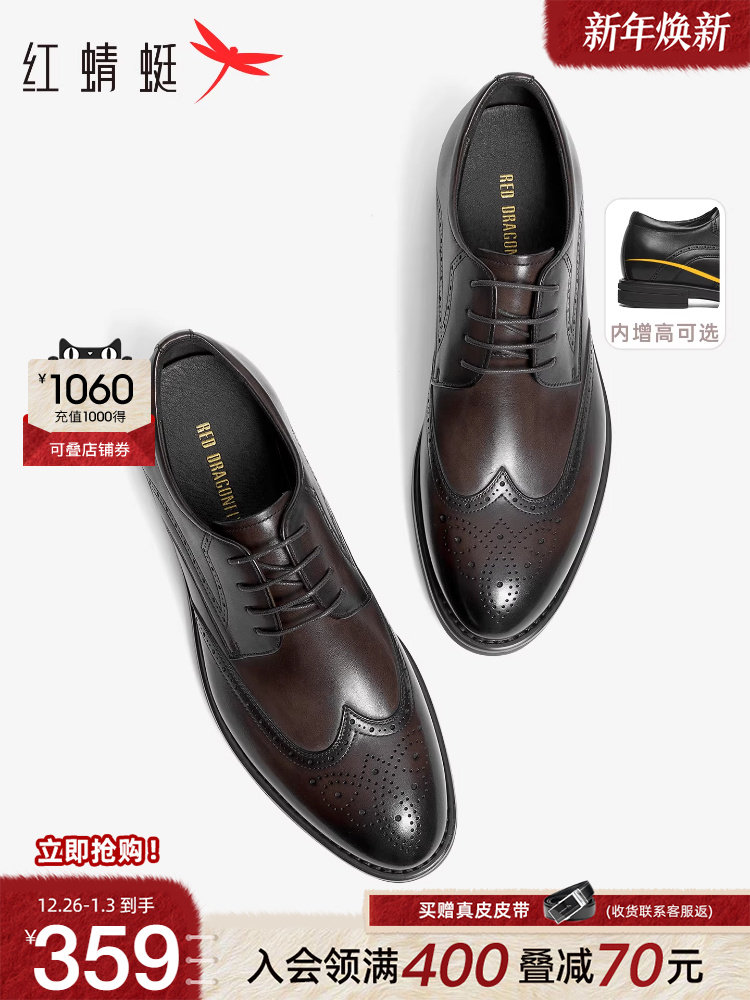 Red Dragonfly Black Knight Leather Shoes Men's New Genuine Leather Brogue Men's Business Formal Height-Increasing Wedding Groom Shoes Men