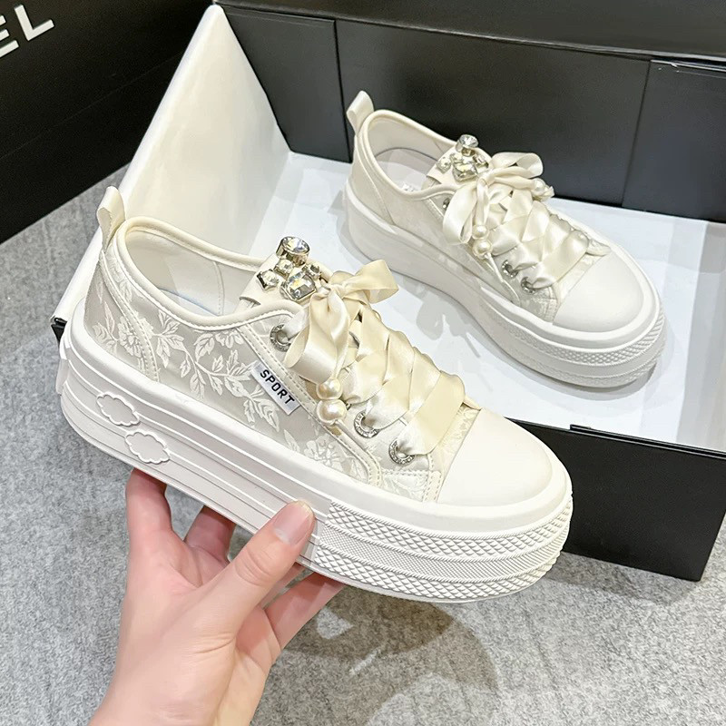 Hong Kong Style Silk Satin Canvas White Sneakers for Women 2025 Spring Breathable Thin Thick-Soled Versatile Rhinestone Casual Sneakers