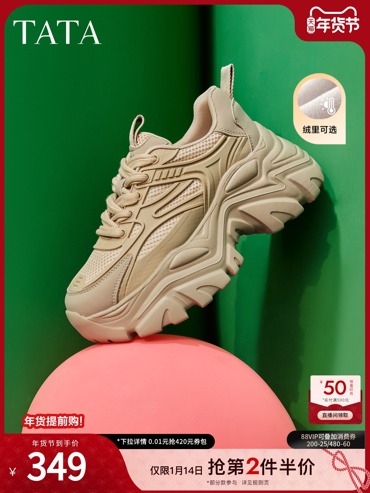 Tata Fleece-Lined Dad Shoes New Women's Casual Shoes Thick-Soled Shoes Height-Increasing Shoes Lightweight Soft-Soled Sports Shoes