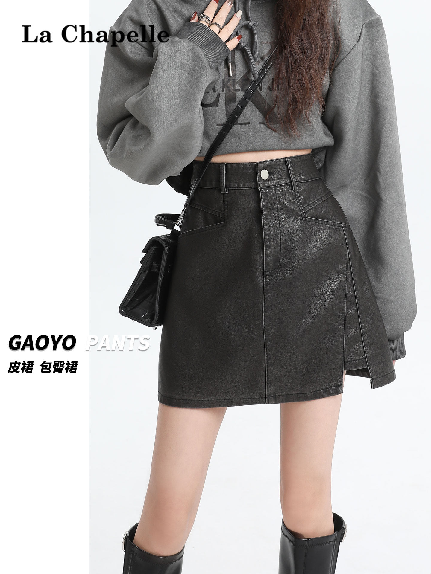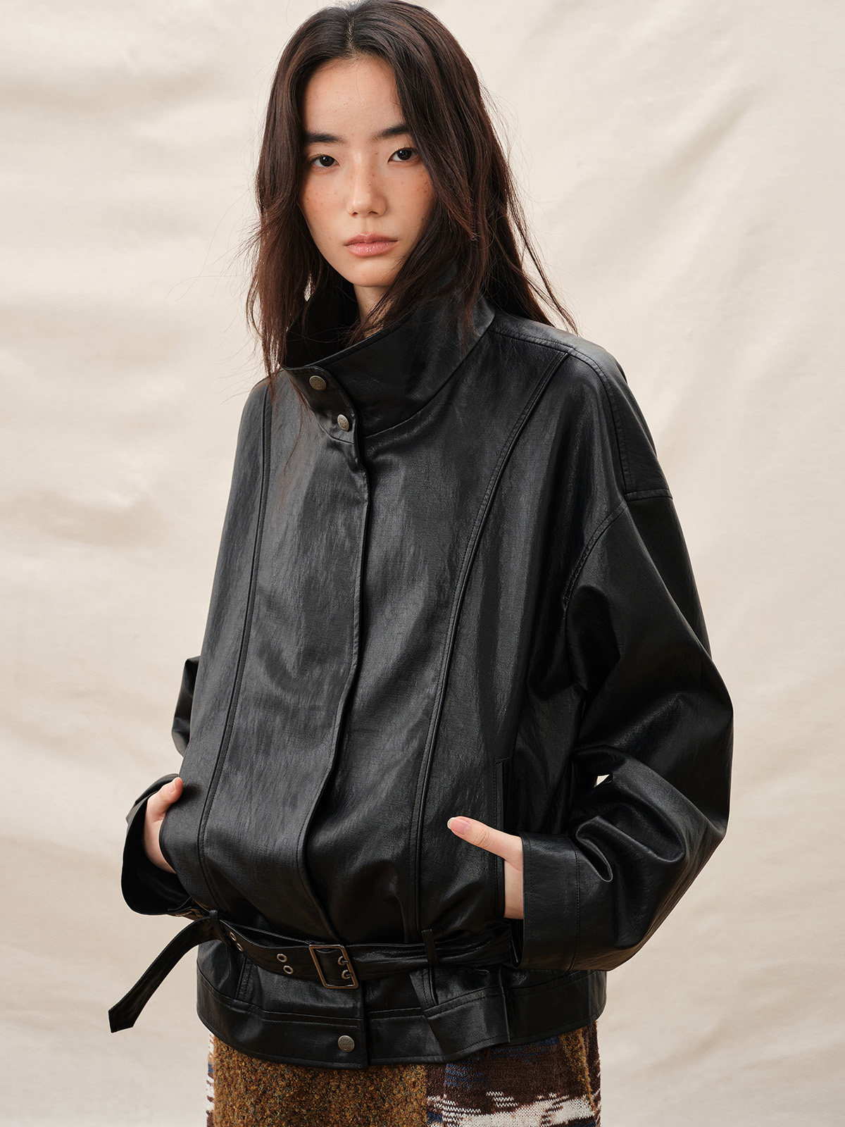 Octopusme Octopus Brand Oil-Waxed Black Protein Leather Jacket for Women, Autumn Stand-Up Collar Lace-Up Biker Jacket