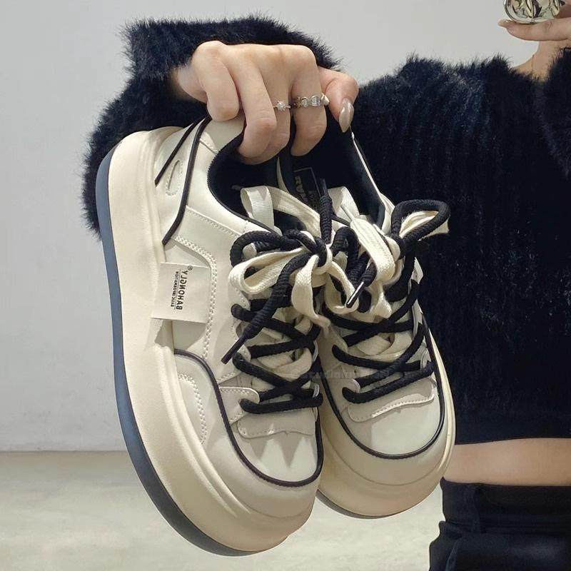 Hong Kong Genuine Leather Thick-Soled White Sneakers for Women 2025 Spring Height-Increasing Wear-Resistant Casual Versatile Color-Blocked Soft-Soled Lace-Up Sneakers