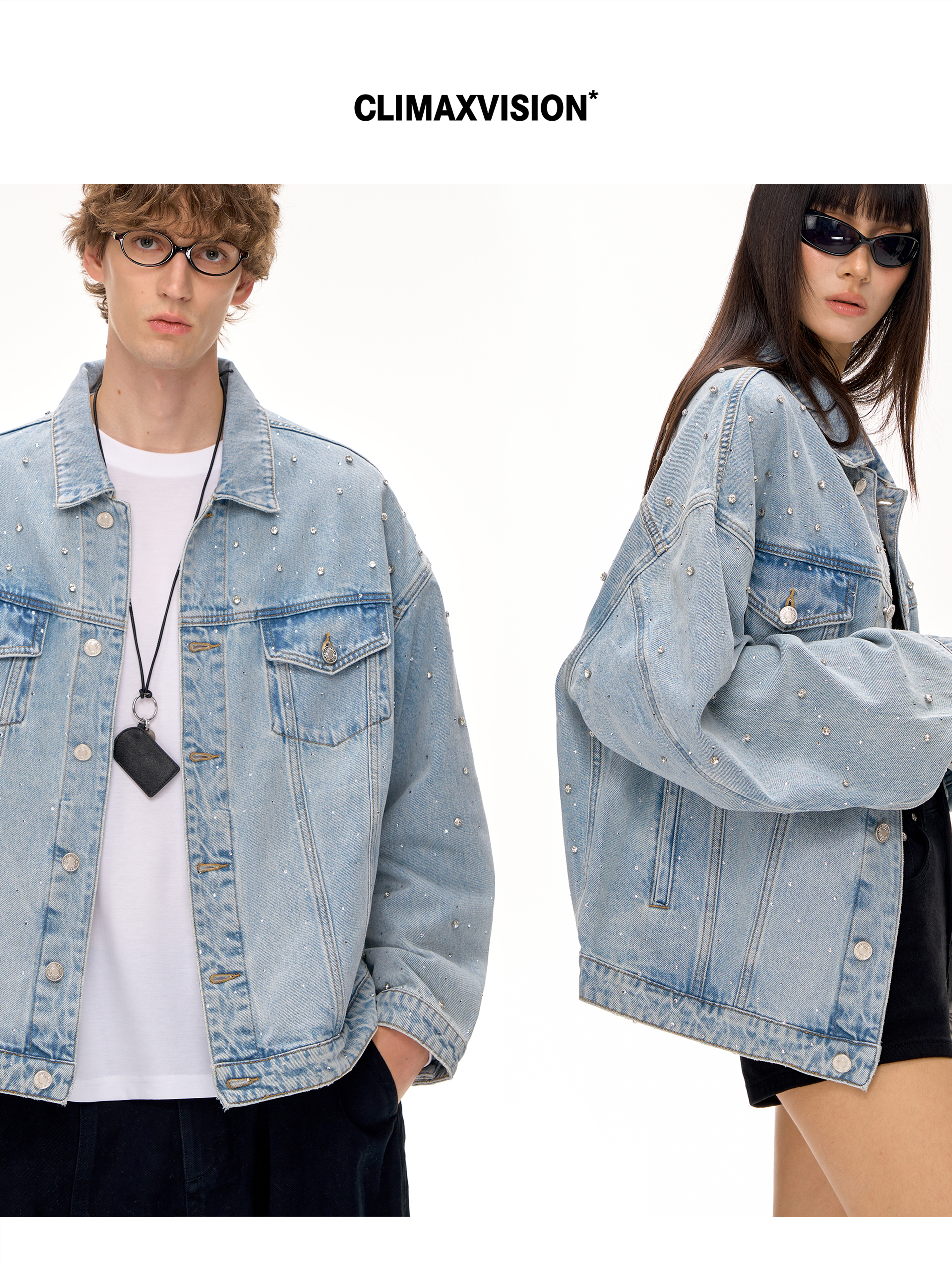 Climax Vision Distressed Vintage Short Wide Silhouette Heavy-Duty Rhinestone Denim Jacket 12.6 oz