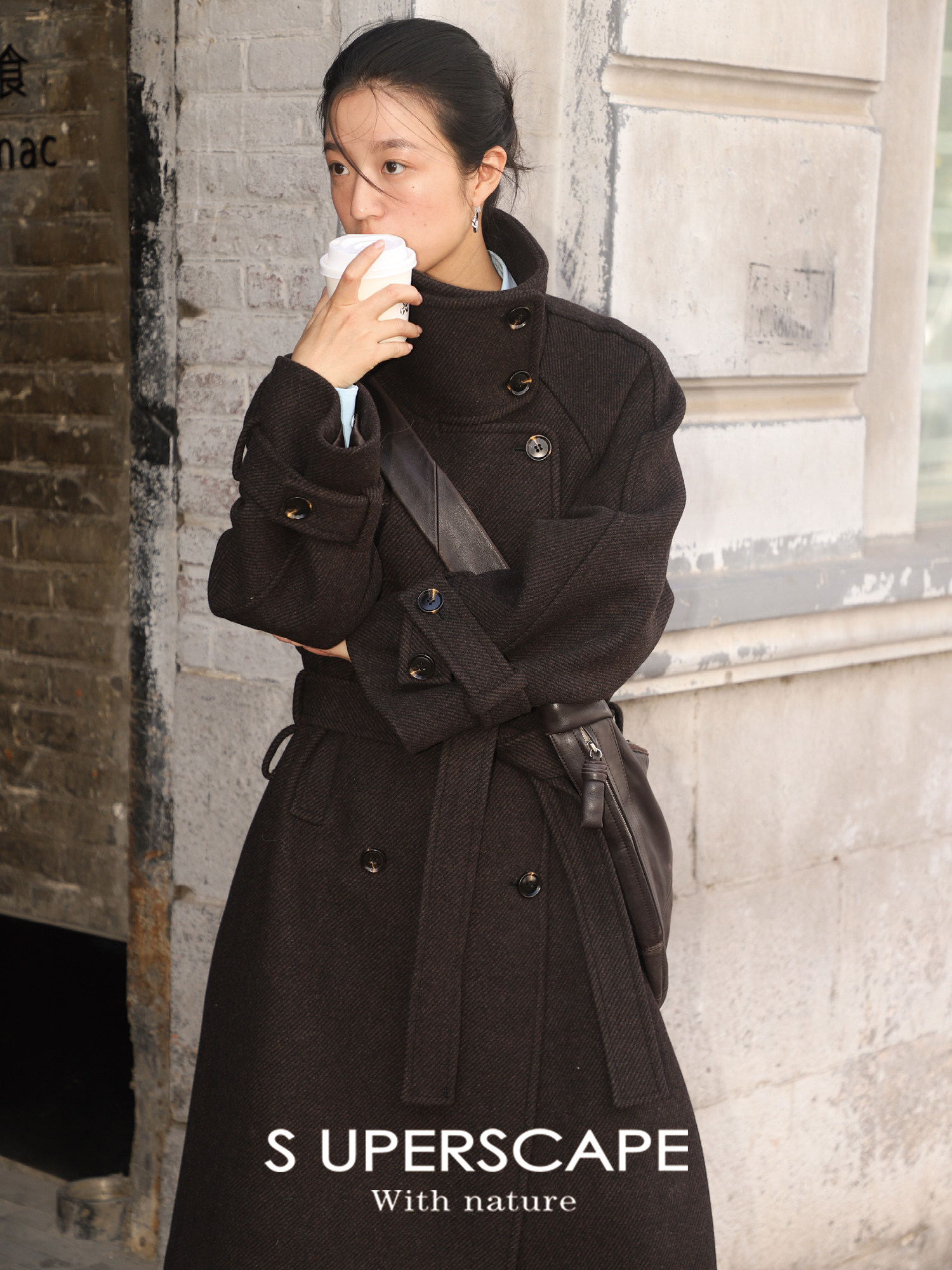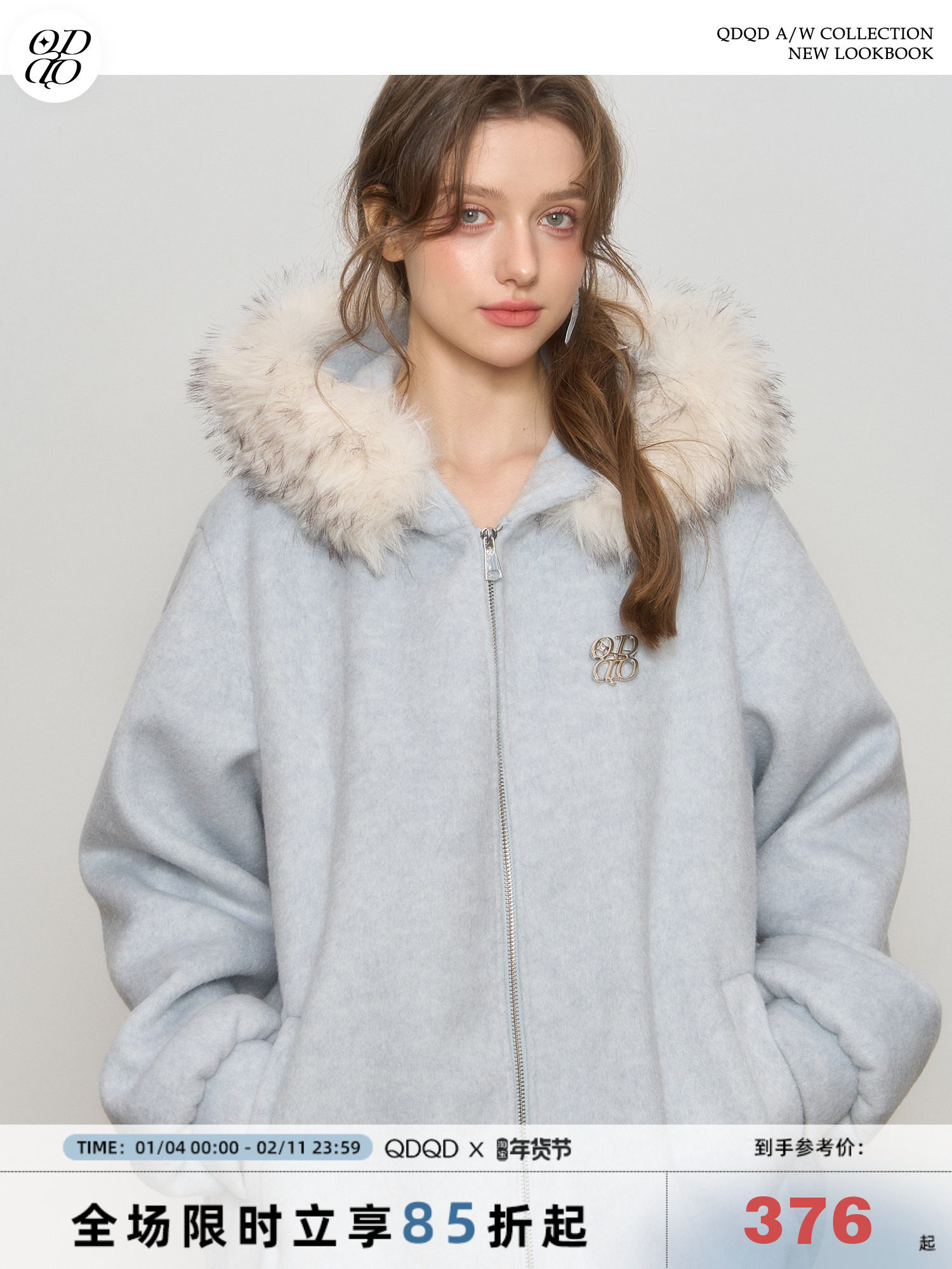 Qdqd Original Hooded Fur Collar Woolen Coat with Cotton Padding, Thickened and Warm, Winter Zipper Sweatshirt Jacket for Women