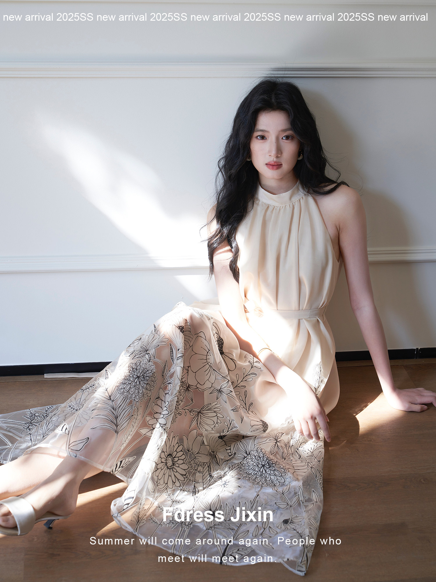 Letter-Style/Blurred Floral Semi-Sheer Positioning Print Halter Neck Dress Loose Tie-Up Vacation Flared Dress