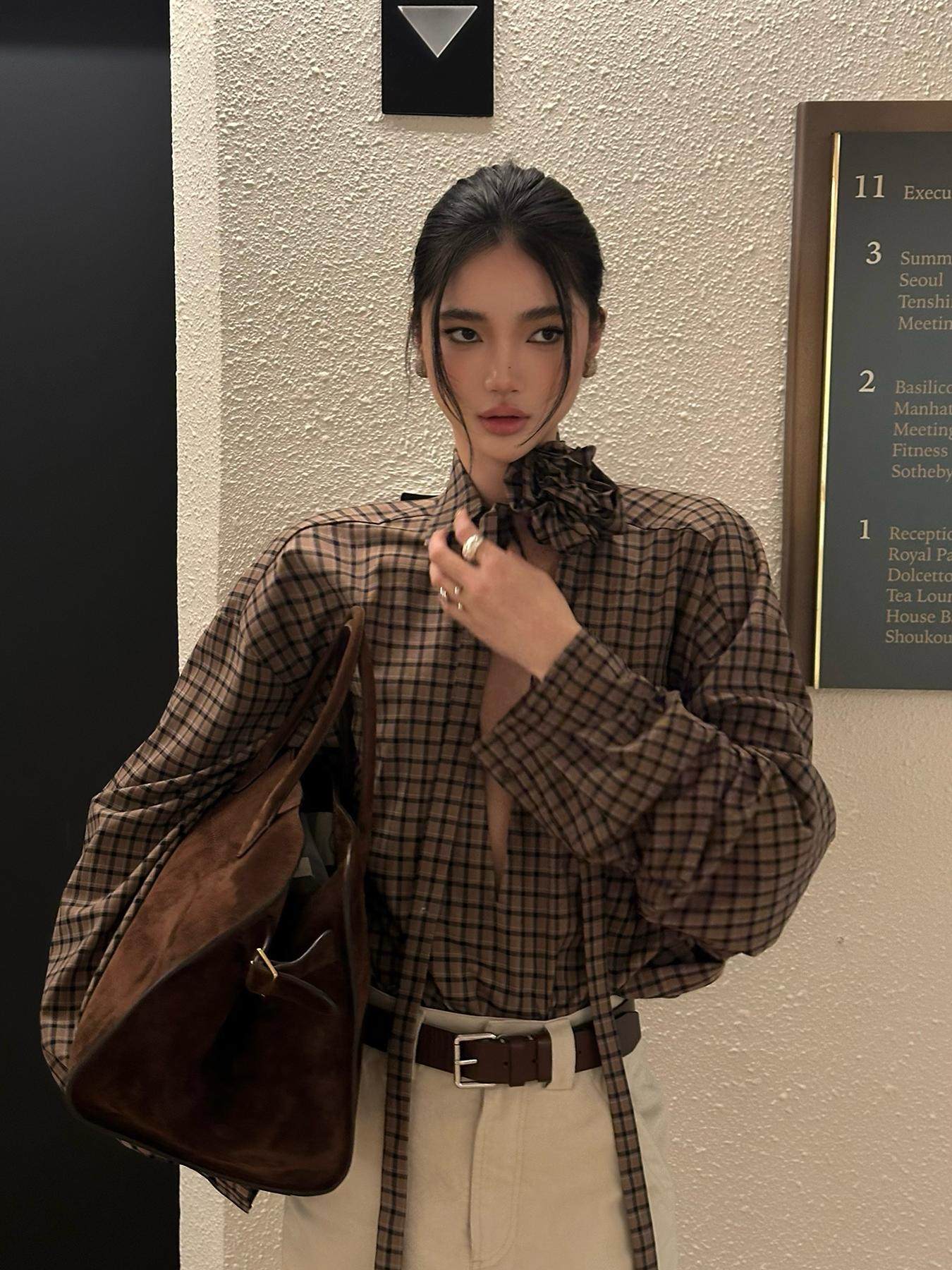 Rovente Film-Style Design Plaid Shirt for Women, Retro Casual Long-Sleeve Ribbon Brown Shirt Jacket