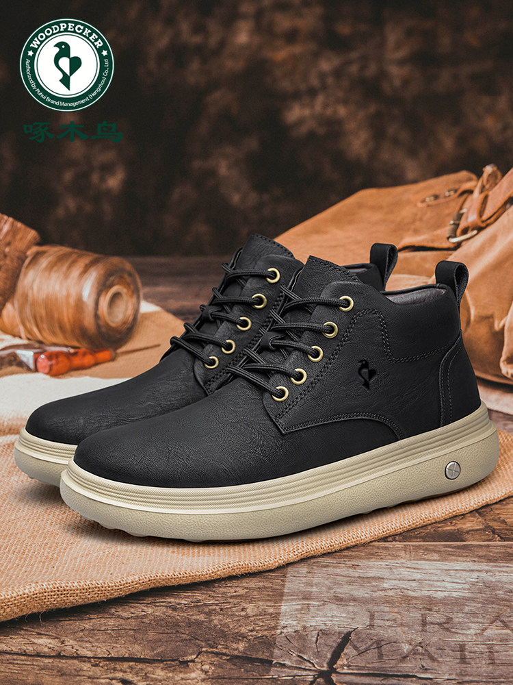 Woodpecker Men's Shoes, New Autumn and Winter Model, Genuine Leather, Breathable, Soft Surface, Soft Sole, Lightweight, Casual, Versatile, High-Top Leather Shoes, Father's Shoes