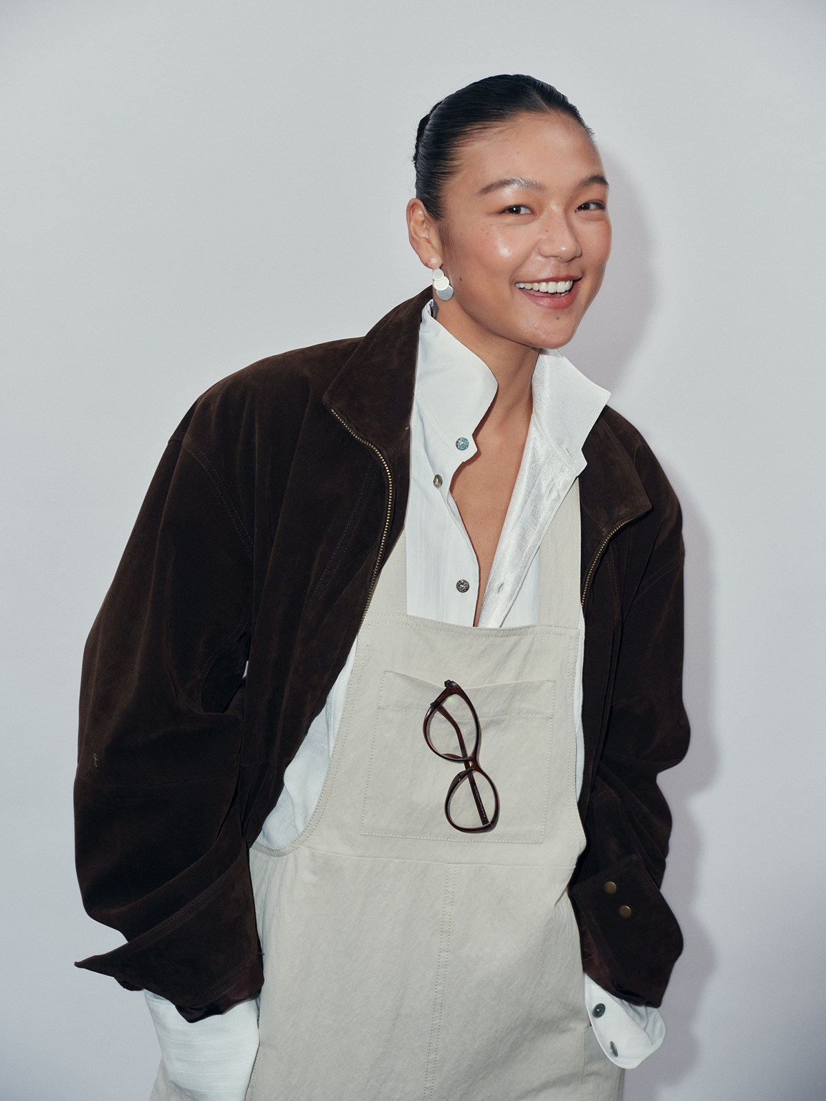 Molin Jennie Wears a Retro Lazy-Style Flocked Suede Jacket with a Loose Silhouette and Brown Coat at the Airport