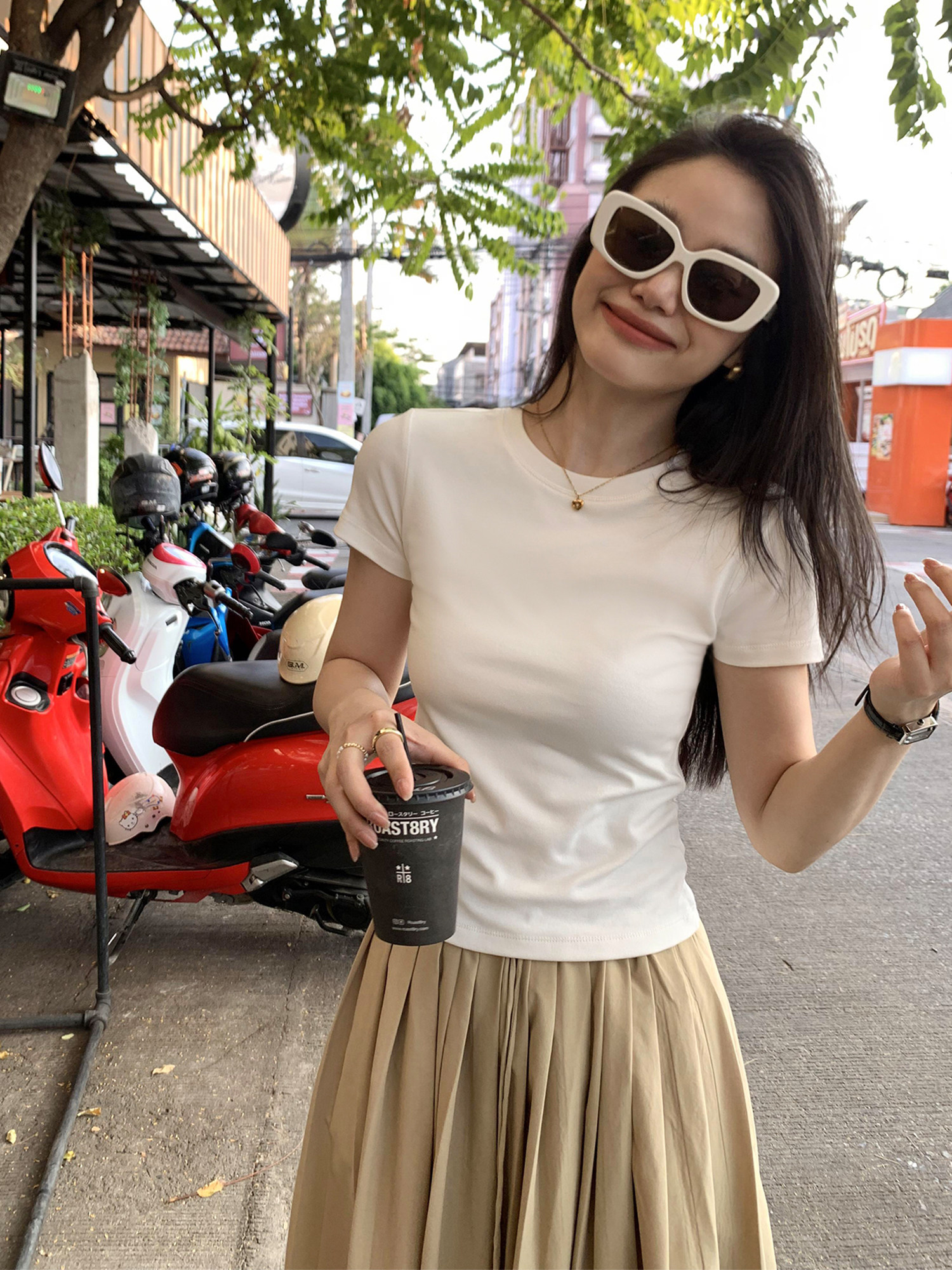 Pusumede Right-Shoulder Round-Neck Short-Sleeve T-Shirt for Women, New Summer Versatile Short Slim-Fit Knitted Base Top