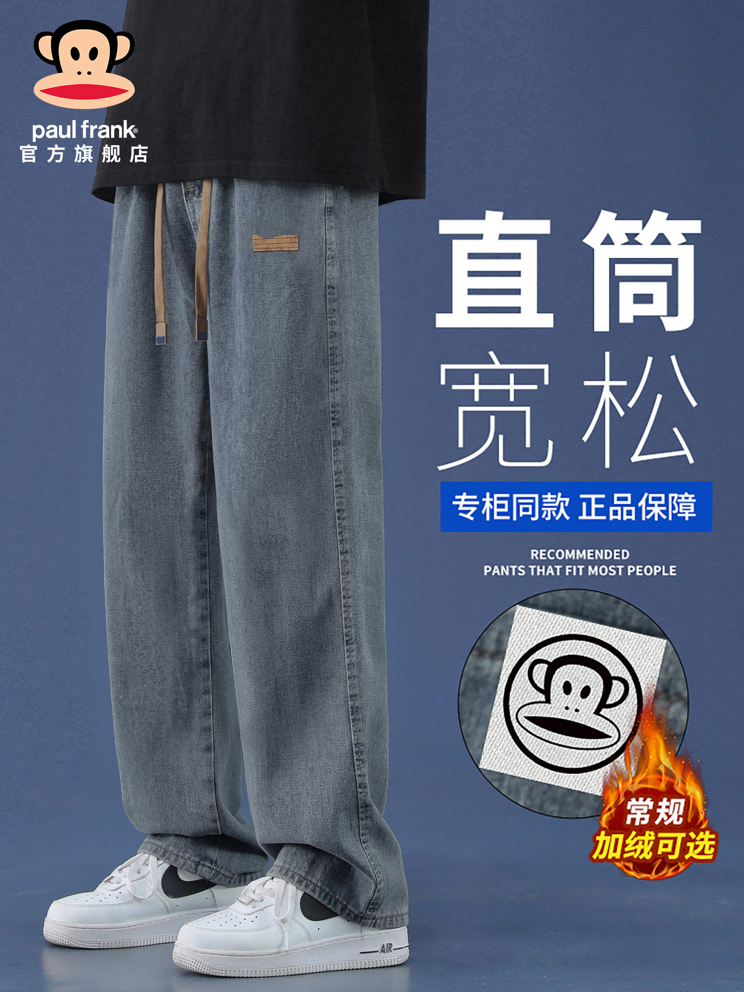 Paulfrank/Big Mouth Monkey 2025 New Jeans Men's Autumn and Winter Fleece-Lined Loose Straight Wide-Leg Casual Pants