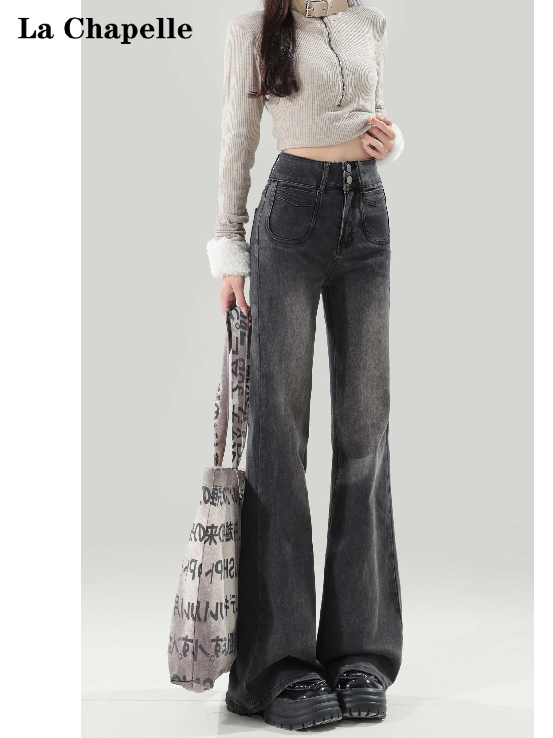 La Chapelle Black and Gray Flared Jeans for Women 2025 New Autumn and Winter High-Waisted Loose Fit Petite Fleece-Lined Pants
