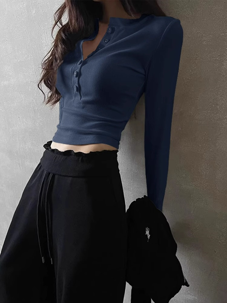 American-Style Spicy Girl Half-Open Collar Long-Sleeve T-Shirt for Women, Spring and Autumn, High-End Slim-Fit Inner Layer, Short Top