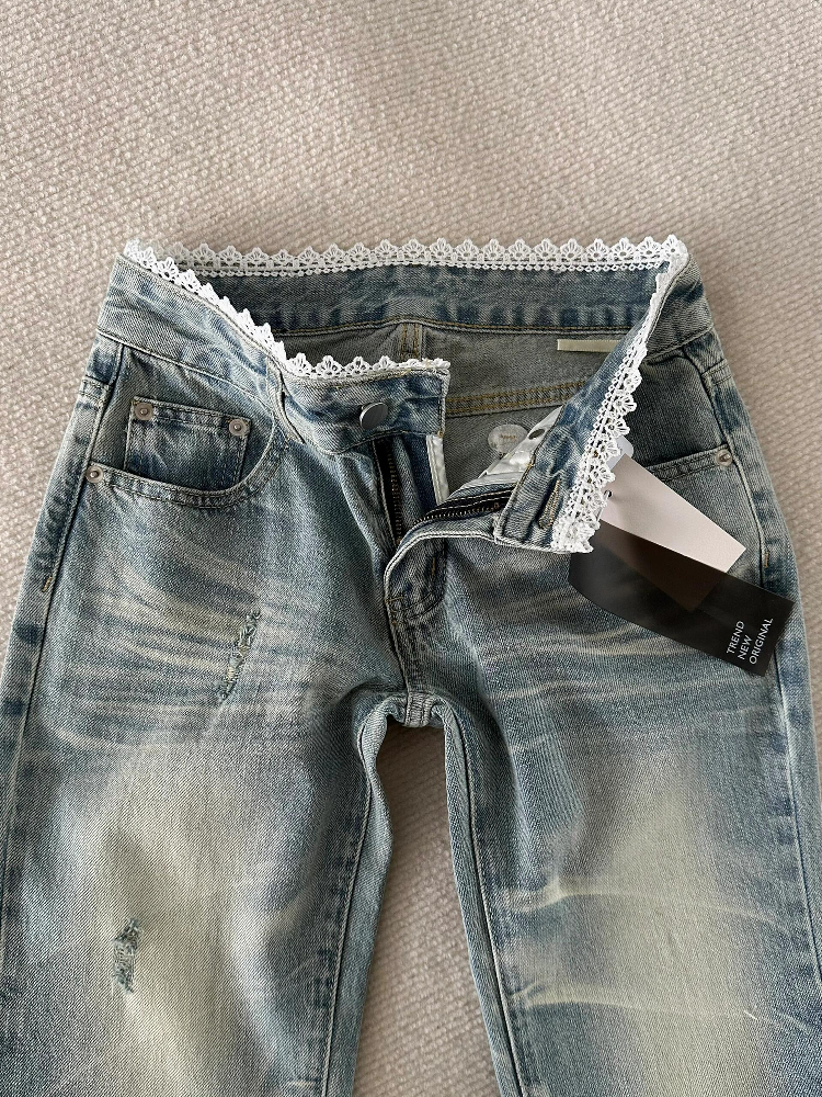 Designed Lace Patchwork Flared Jeans for Women, New Autumn Low-Waist Stretchy Slimming Petite Bootcut Pants
