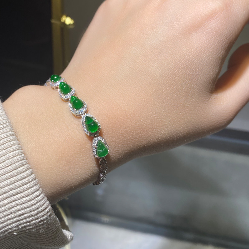 Natural Jade A-Grade Ice Type Full Green Gourd 925 Silver Inlaid Bracelet Jewelry for Women, Versatile and High-End Bracelet