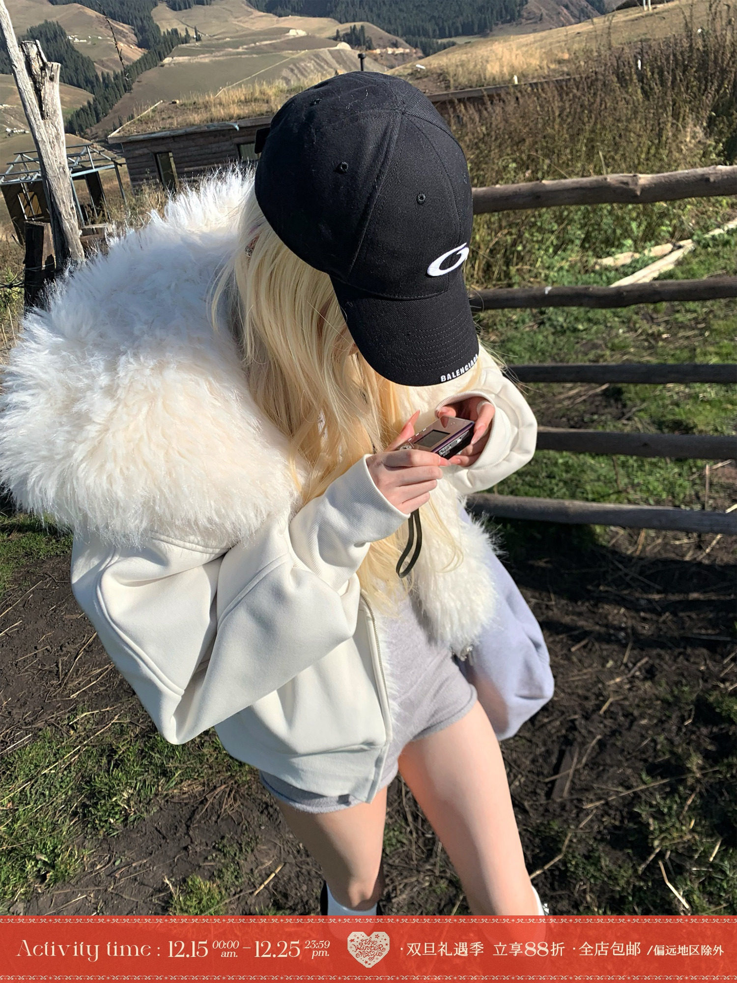 Rase Le Sol'Love of Fate' White Fur Collar Fleece-Lined Short Hooded Thickened Sweatshirt Jacket