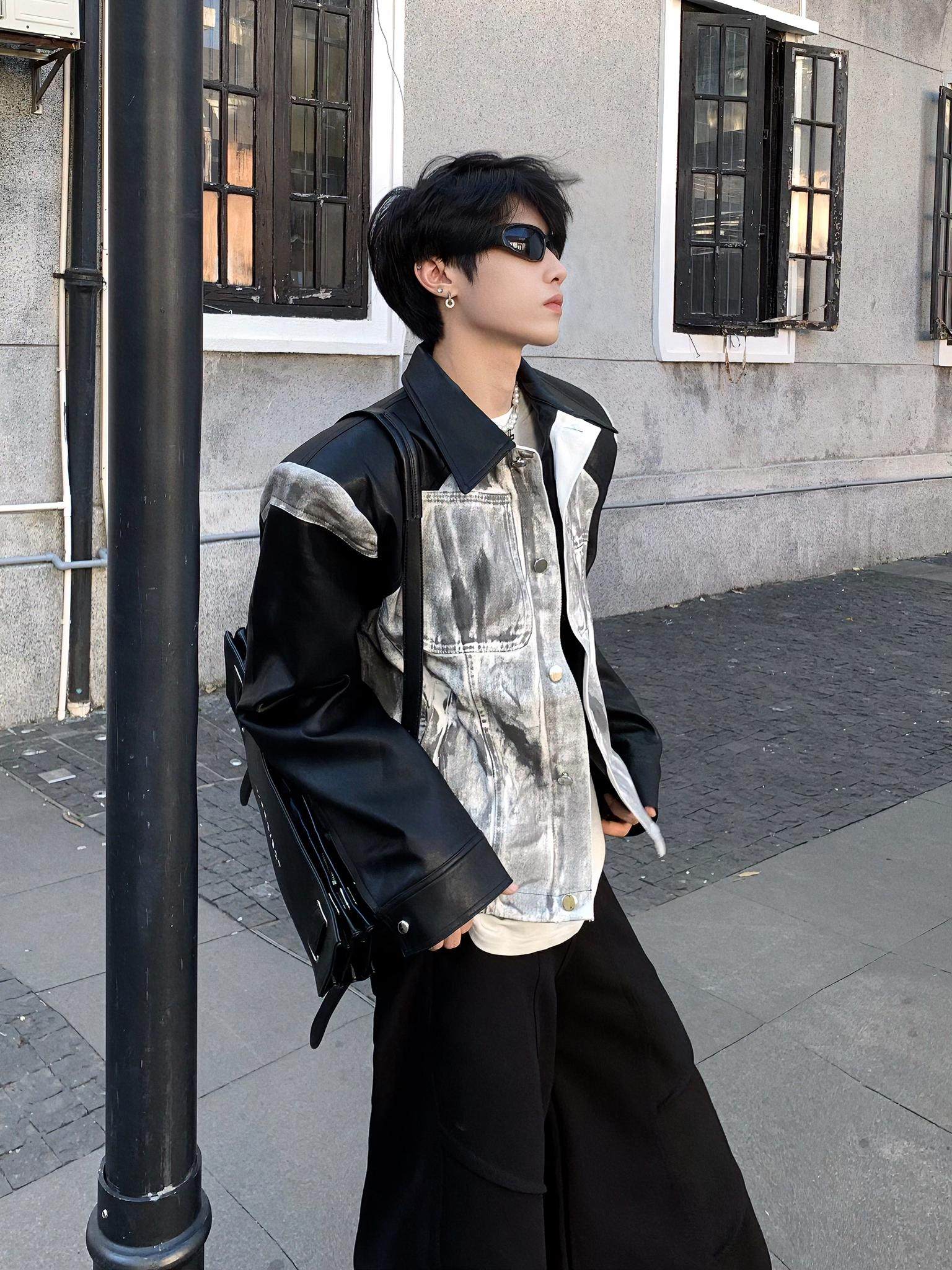 Black Cangshe/Unique Punk Patchwork Design Motorcycle Leather Jacket for Men, Winter Cool Distressed Shoulder Pad Jacket