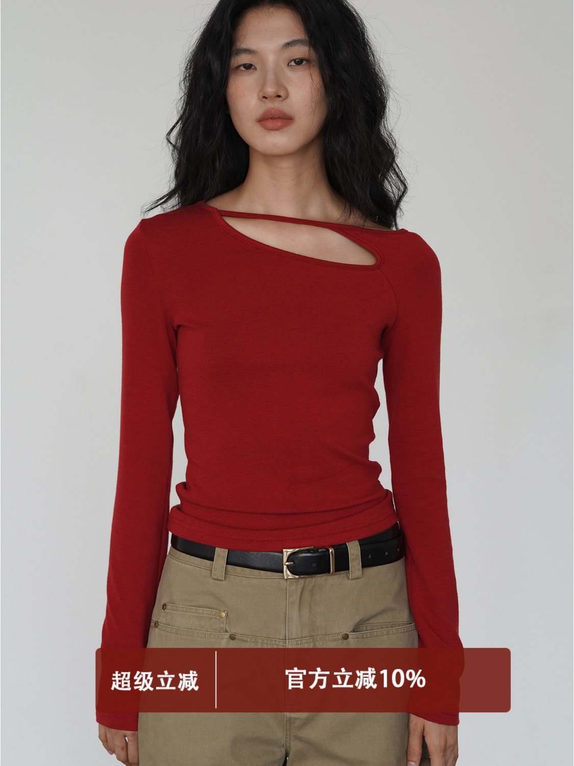 EIGHTHMONTH Red One-sided Hollowed-out Long sleeves Tops Women's Stylish Niche style Spring Slim Looking Base T-shirt