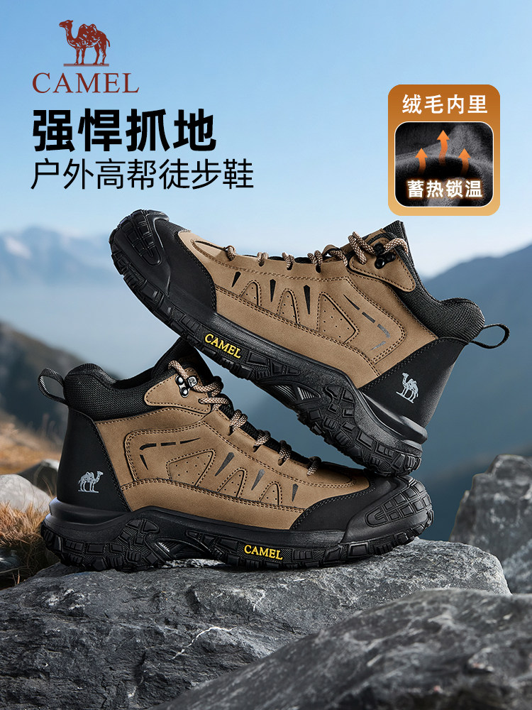 Camel Men's Shoes 2025 Winter New High-Top Fleece-Lined Non-Slip Waterproof Hiking Shoes Thick-Soled Height-Increasing Wear-Resistant Trekking Shoes