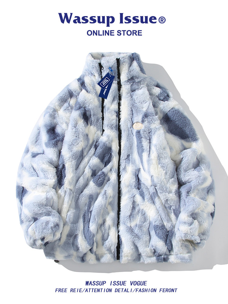 Wassup Issue American Style Trendy Tie-Dye Sherpa Fleece Jacket for Men, Winter Cool and Loose-Fitting Warm Cotton Coat for Men