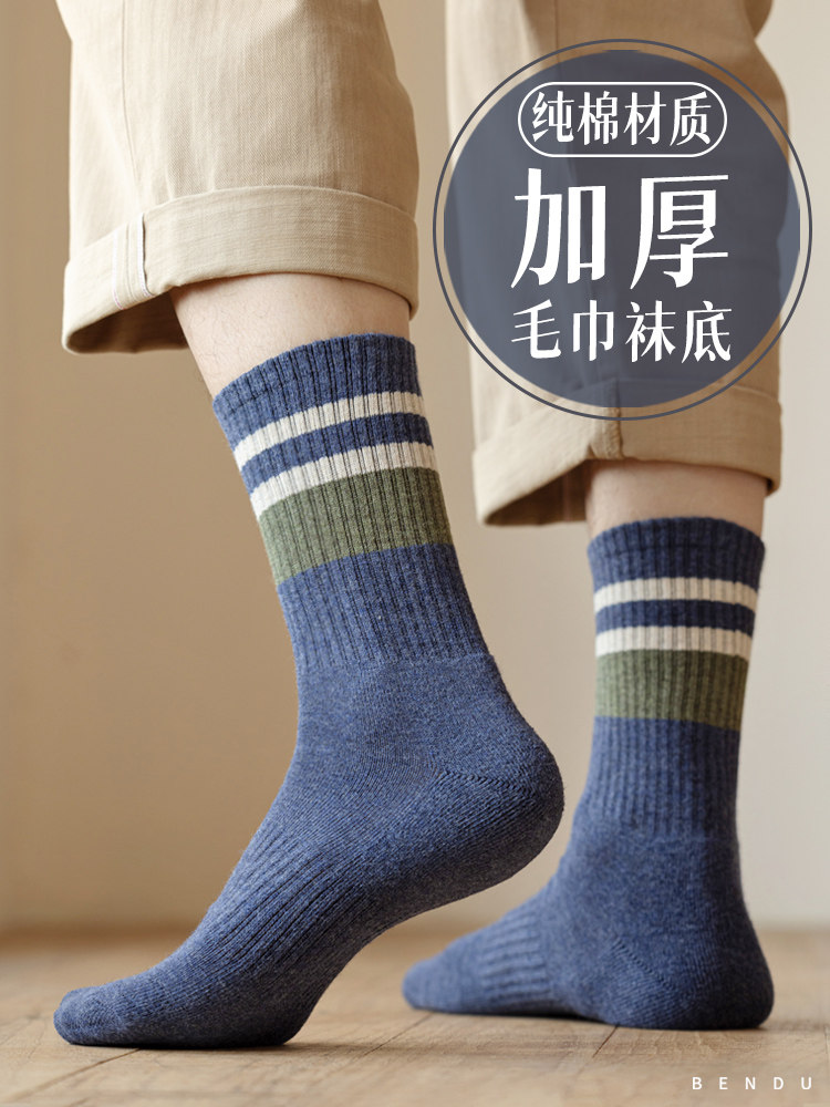 Mid-Calf Socks for Men, Autumn and Winter Style, Thickened and Fleece-Lined, Pure Cotton, Sweat-Absorbent, Odor-Resistant, 7A Antibacterial, Towel Bottom, Long Socks, All Cotton