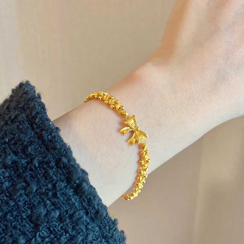 Gold Bow Bracelet, Runaway Princess Bracelet, Pure Gold Beaded Braided Bracelet, Birthday Gift for Girlfriend