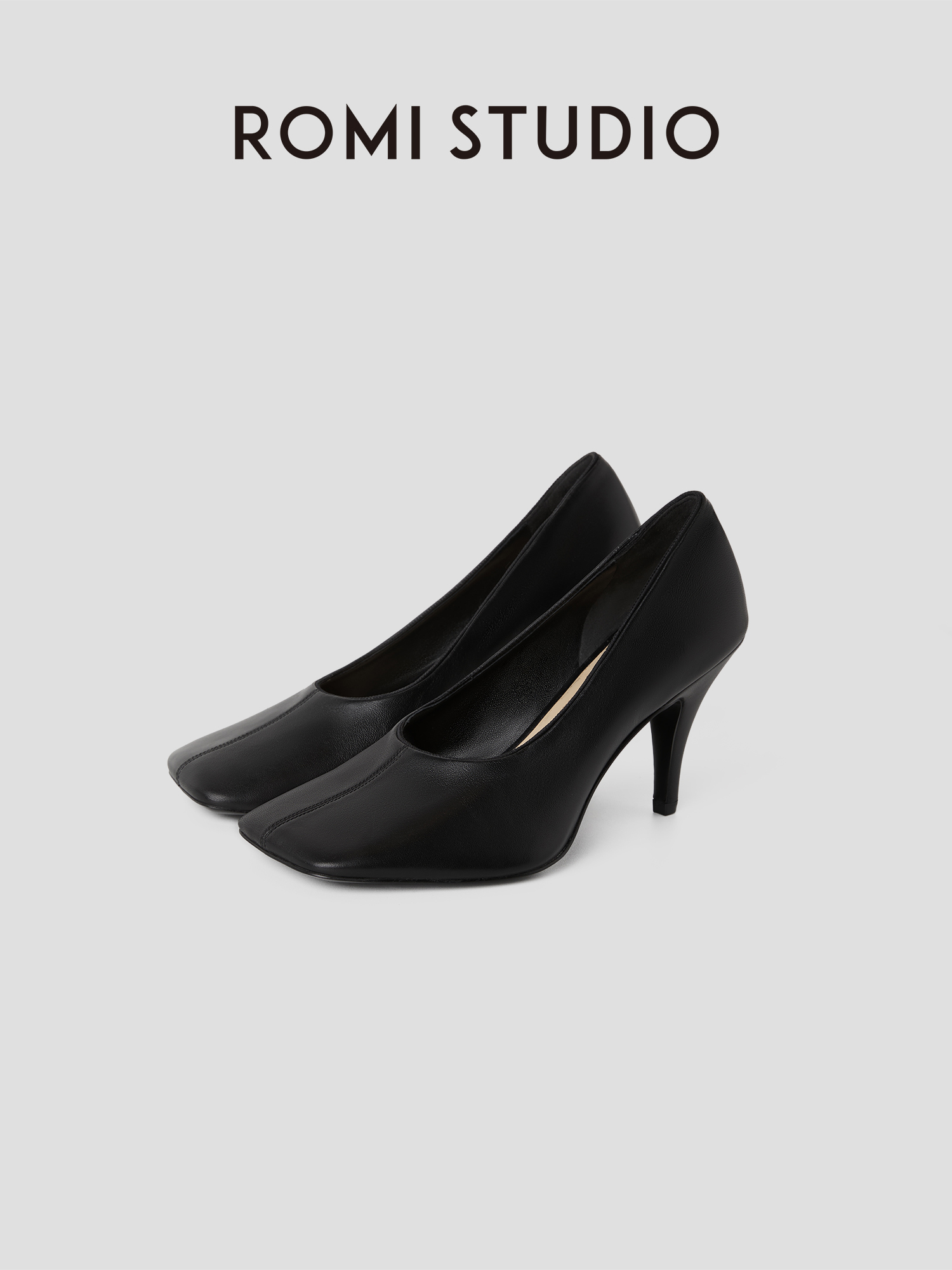 Romi Studio Sheep Leather Black Minimalist Square Toe Shallow Mouth Stiletto High Heels Rwcrp33095