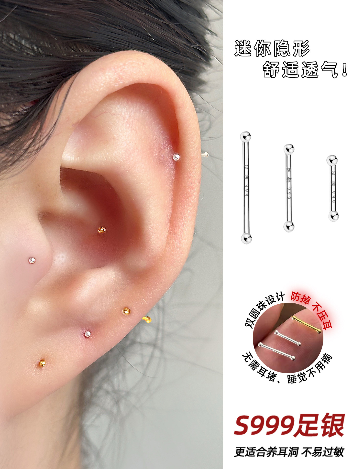 999 Pure Silver Earrings Mini Invisible Ear Piercing Anti-Clogging Ear Bone Studs Exquisite Small Ear Care Sticks Cochlear Studs for Students
