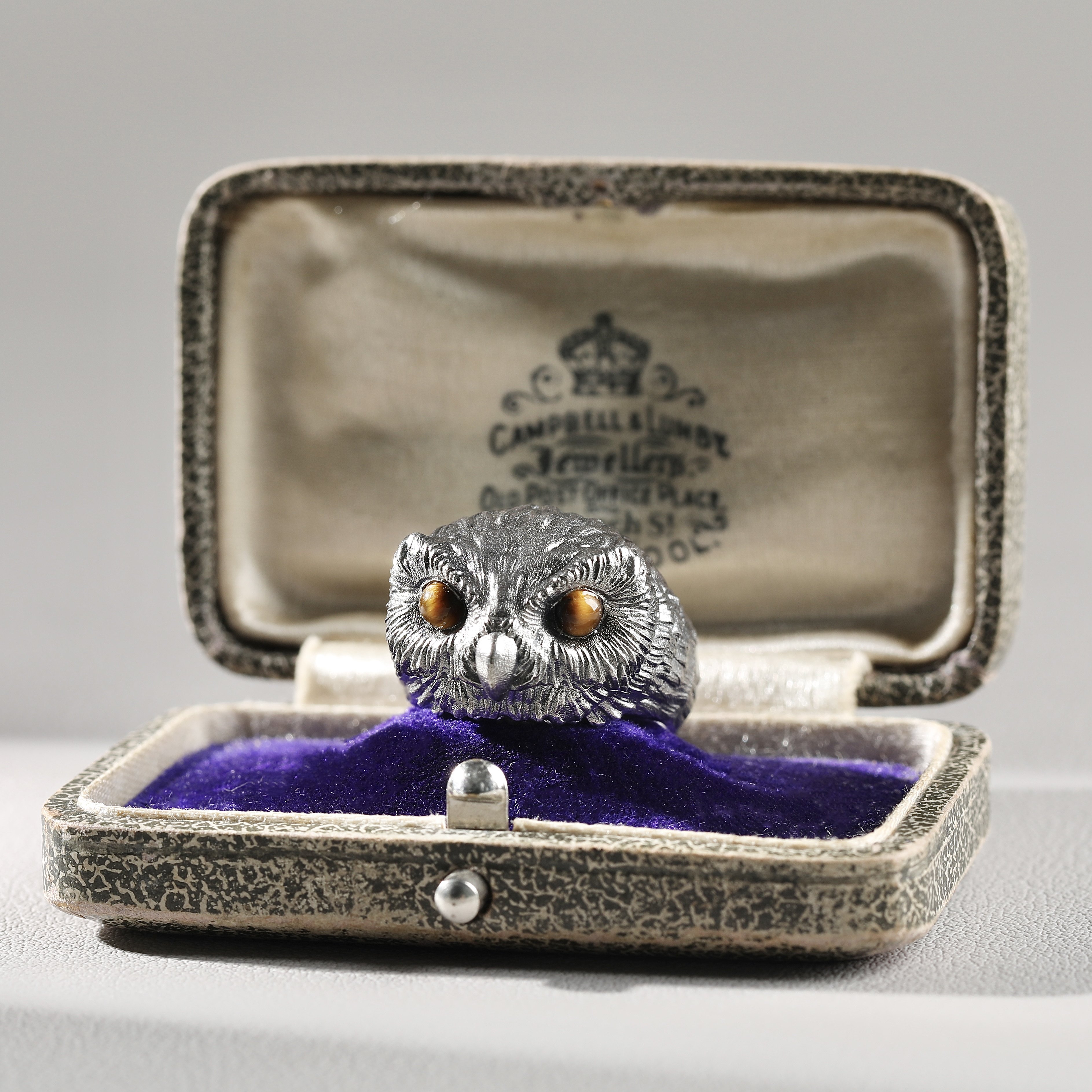Zhou Yin Yin S925 Sterling Silver Owl Open Ring Inlaid with Tiger Eye Stone Vintage Ring for Men and Women Couples Original Design