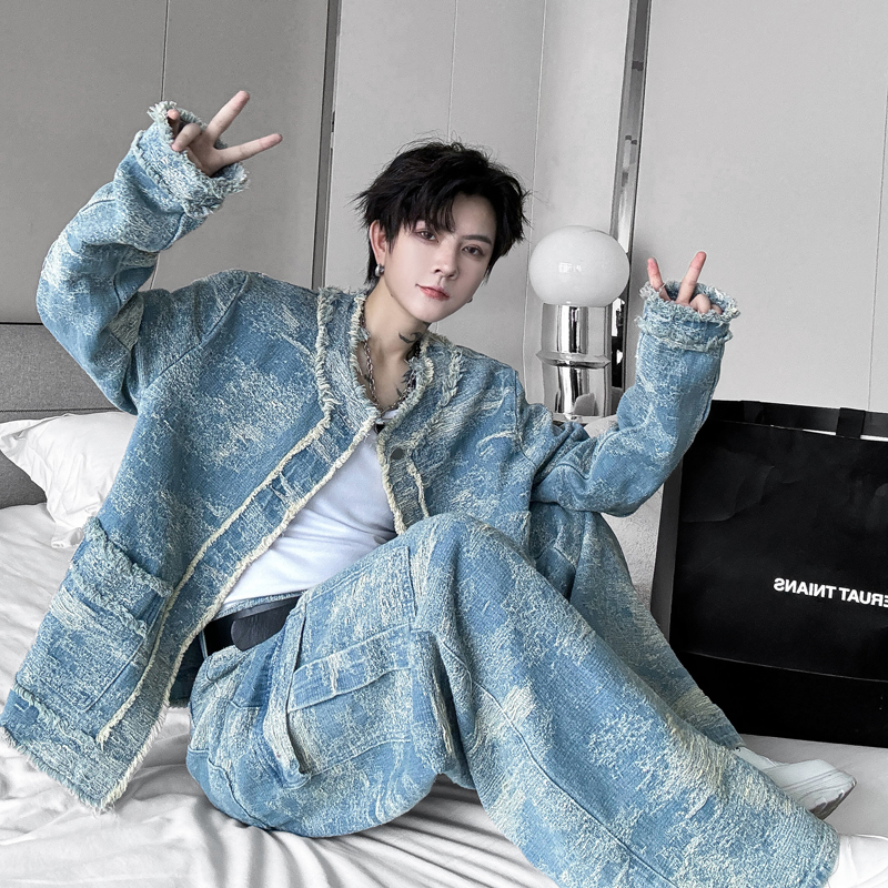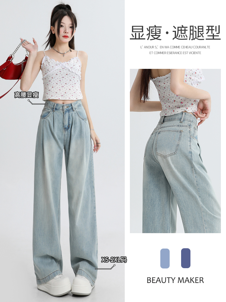 Light Blue Silk Pleated Wide-Leg Jeans for Women, Loose Straight-Leg, Autumn and Winter, Fleece-Lined, High-Waisted, Drapey, Soft and Casual, Floor-Length