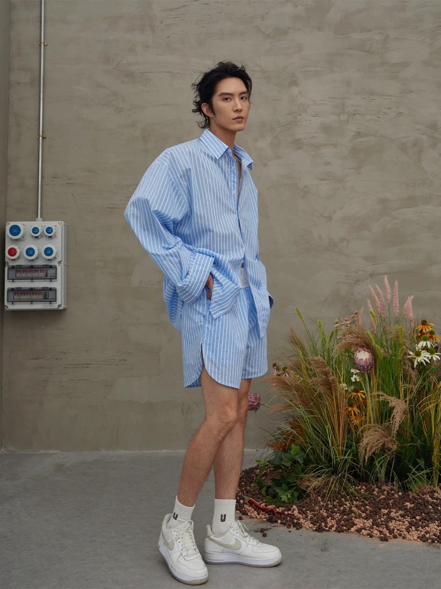 Casual Lazy Style Long-Sleeved Shirt, Simple Loose Striped Blue Shorts Shirt, Unisex Couple Outfit