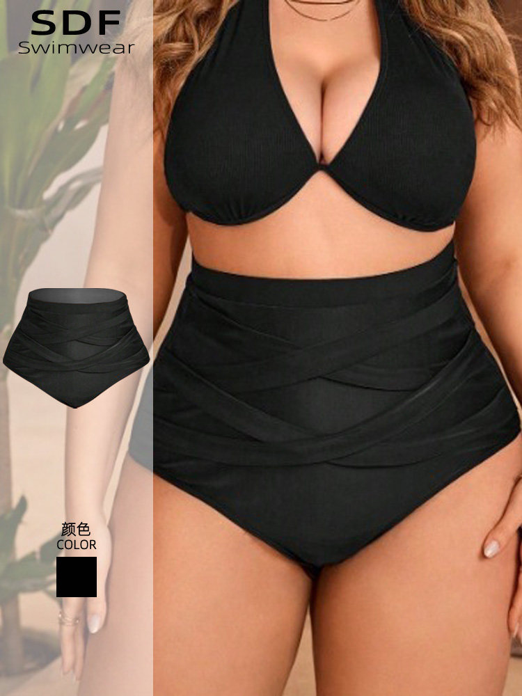 European and American Style Black High-Waisted Triangle Swim Trunks for Women, Single Piece, Large Size, Tummy-Covering, Slimming, Anti-Exposure Swimming Shorts for Hot Springs