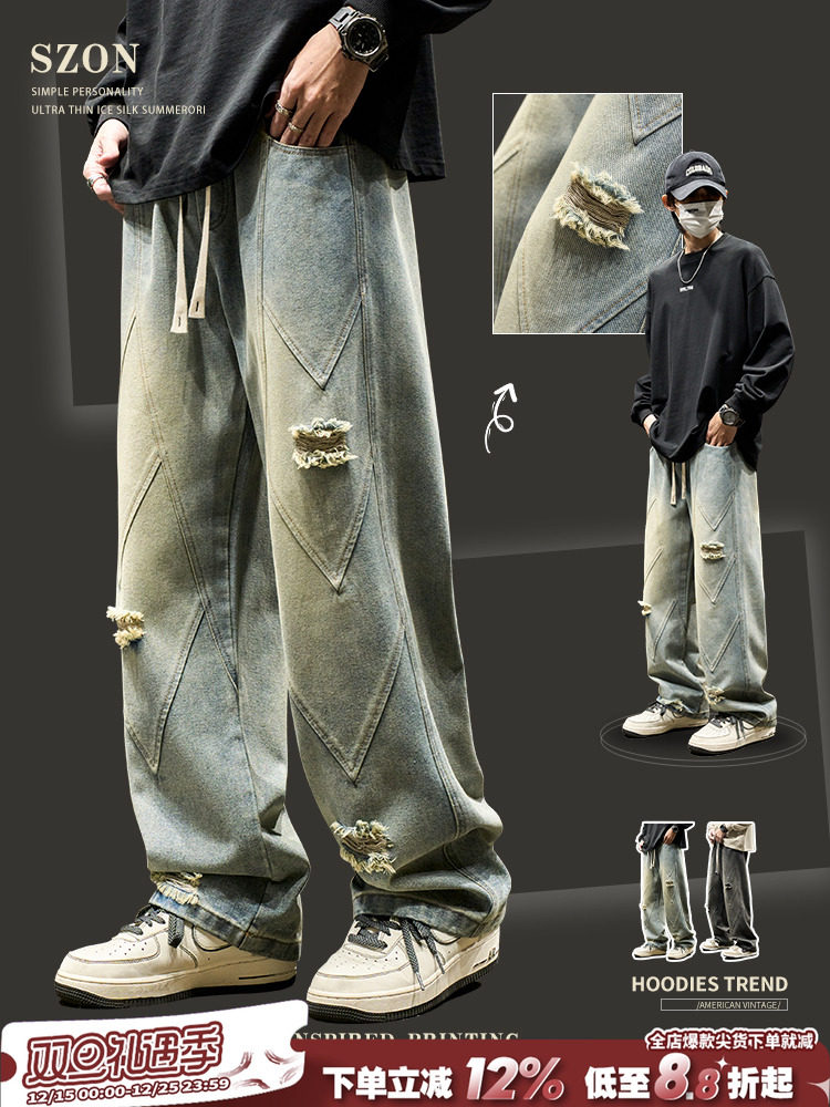 Ripped Jeans for Men, Autumn and Winter, American High Street Style, Vintage Washed and Distressed Long Pants, 2025 New Trendy Brand Straight-Leg Pants